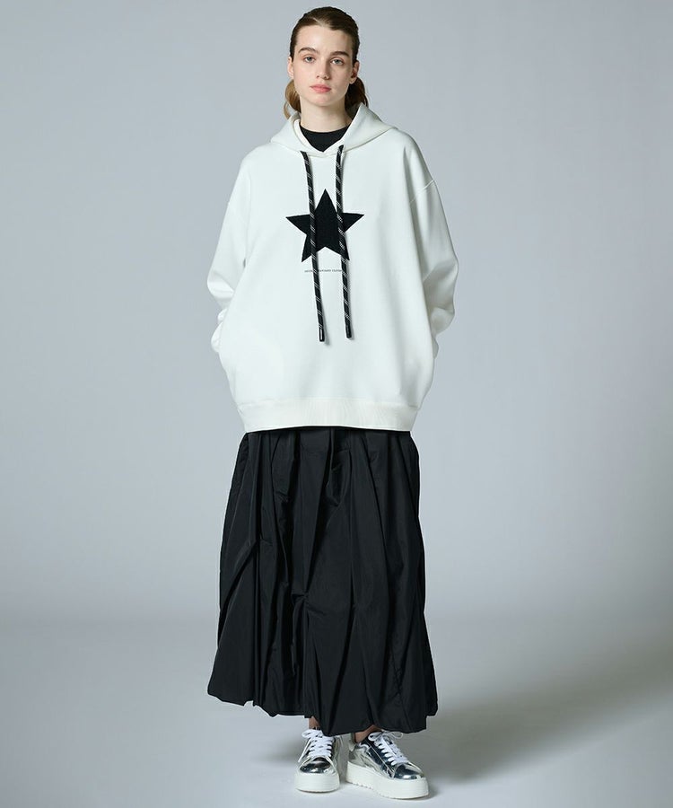 シンプルながらも着回しやすいダンボールフードパーカー。フロントには星の刺繍をあしらい、さりげないアクセントを添えました。バックにはブランドのロゴをあしらい、後ろ姿も抜かりないデザインに。カラー展開はオフホワイトとブラックの2色で、パンツやスカートなどボトムスを選ばず使いまわせるアイテムです。