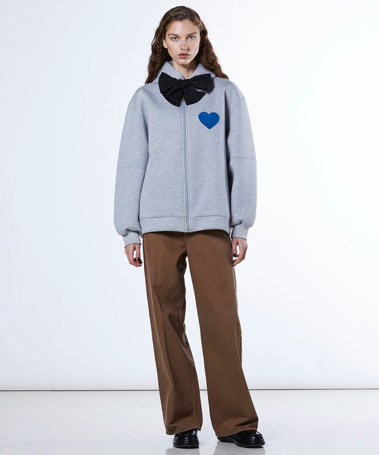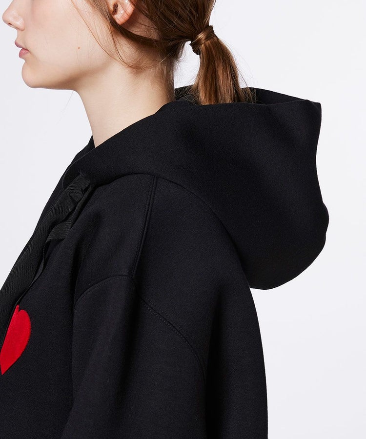 ハートのワッペンと太めのリボンがアクセントになった、オーバーサイズのスウェットパーカー。マニッシュな印象のパーカーを、ダブスタらしくフェミニンにアレンジしました。袖の切り替えによる立体的なシルエットや、背面のさりげないロゴ刺繍など、360度どこから見てもデザイン性の高い一枚。エッジの効いた大人フェミニンなムードで、カジュアルながらも女性らしさを演出します。