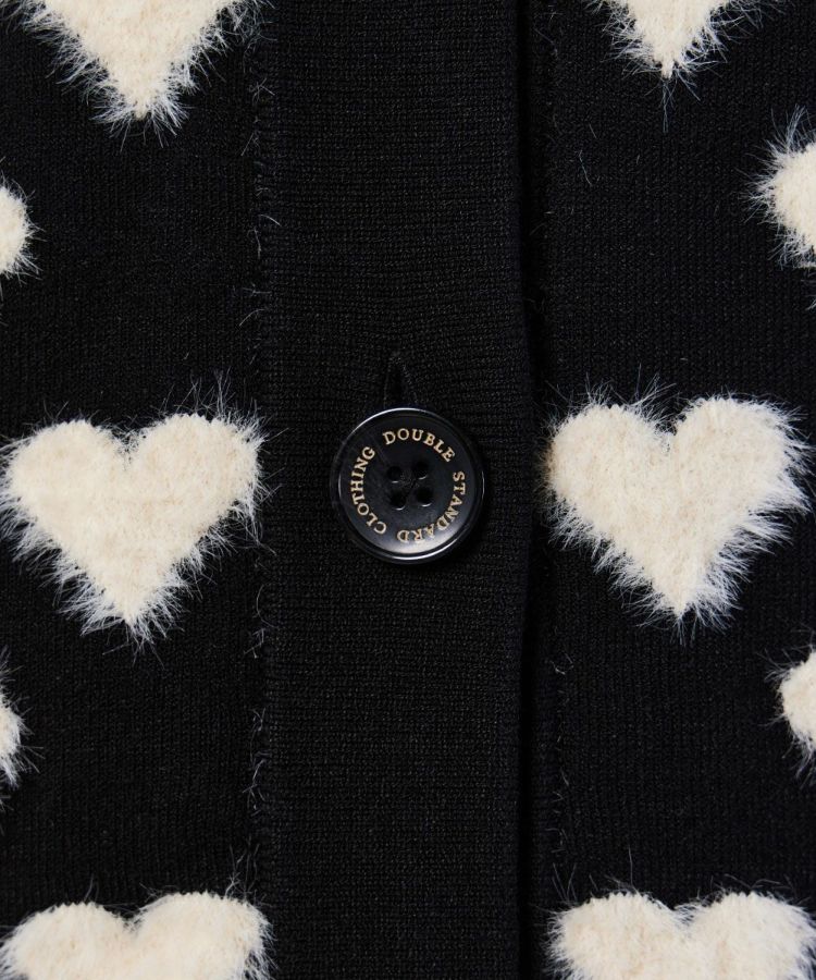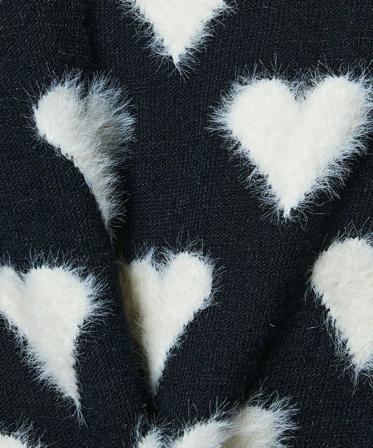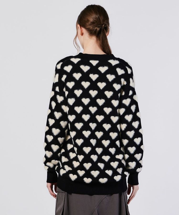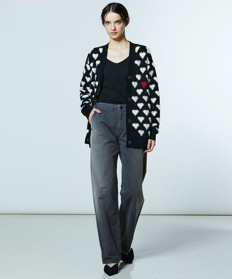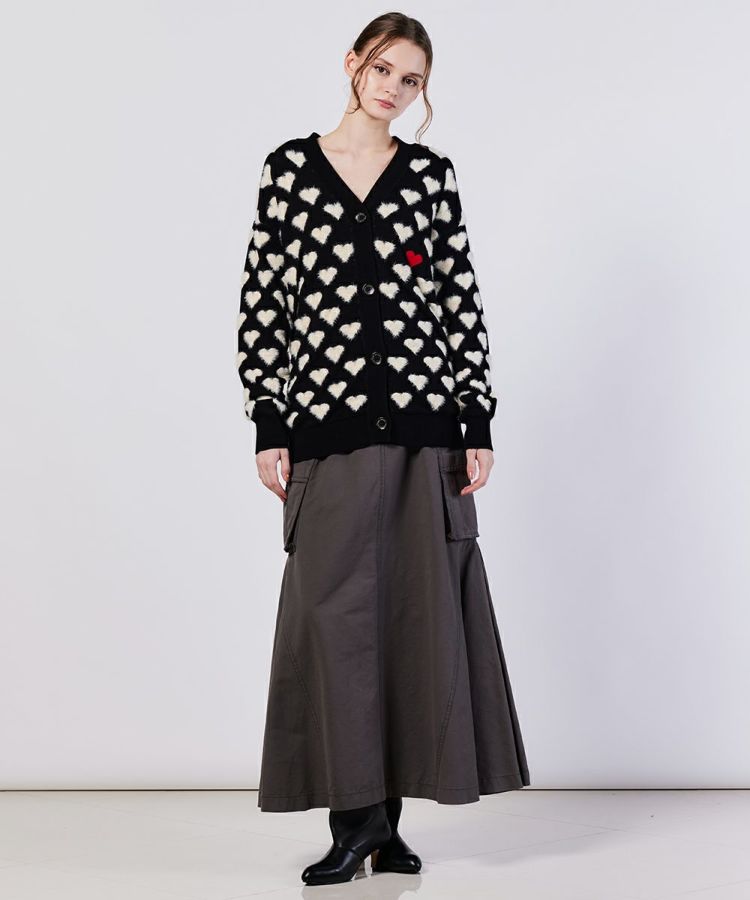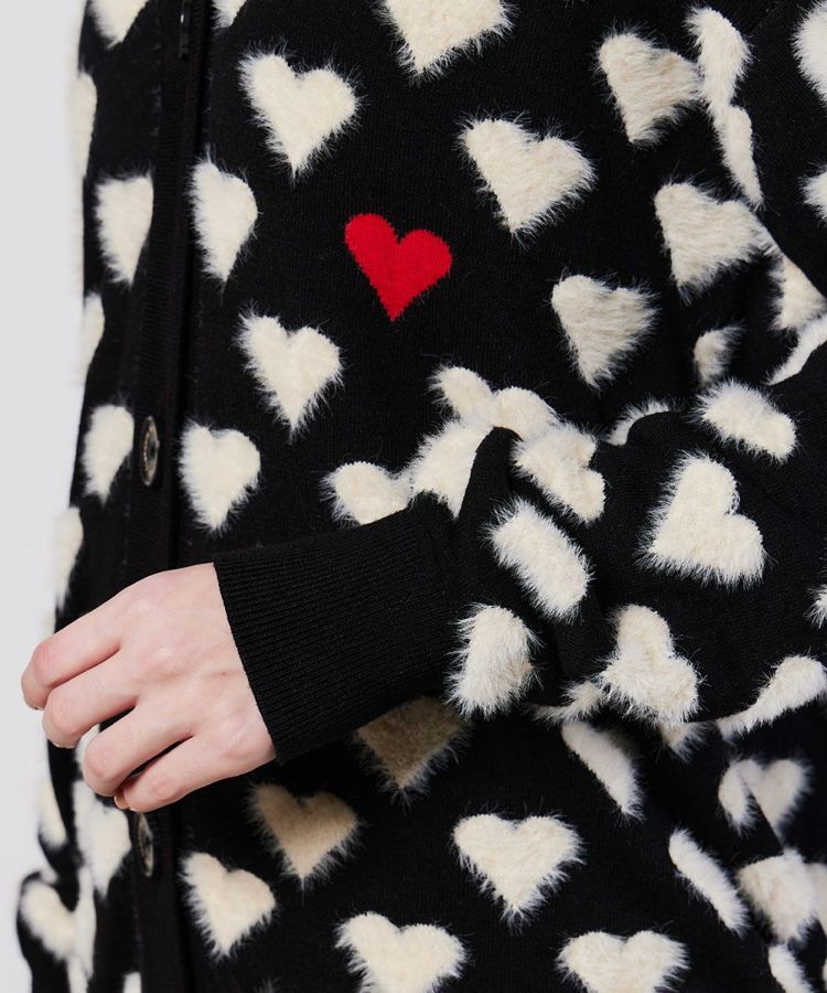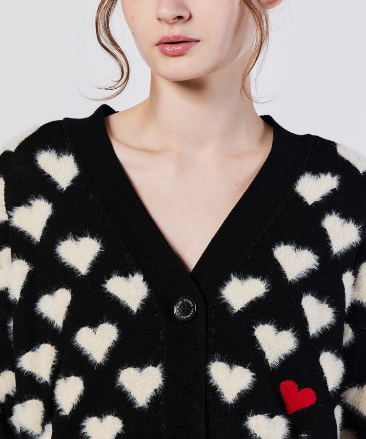 毛足の長いシャギーモールで小さなハート柄を表現した、キュートなカーディガン。左胸の一箇所を赤いハートにすることで、さりげない遊びごころを添えました。キャッチーなデザインながらも、モノトーンベースで甘くなりすぎず大人っぽい印象に。ゆったりとしたシルエットで、デニムにもスカートにも合わせやすく、着こなしの幅が広がります。