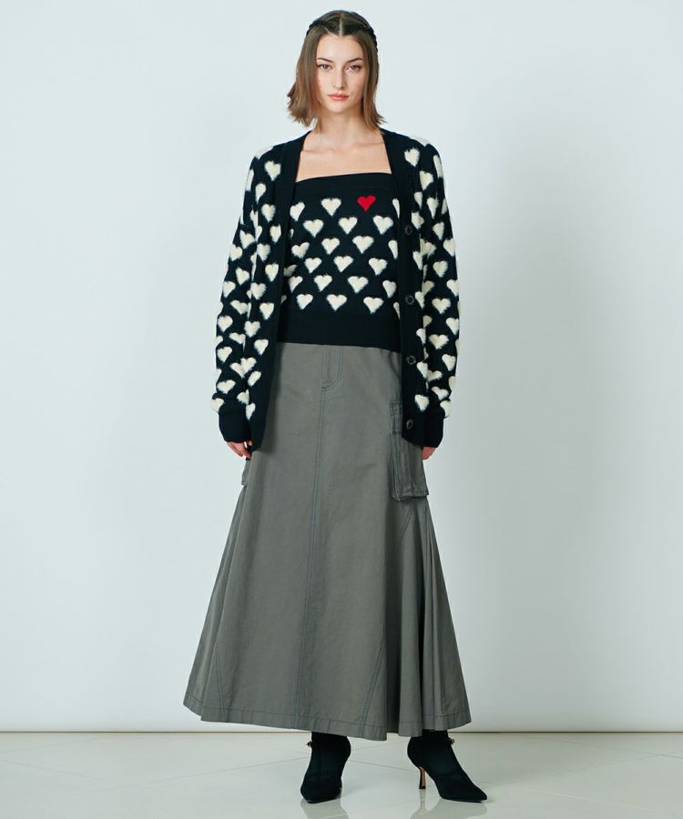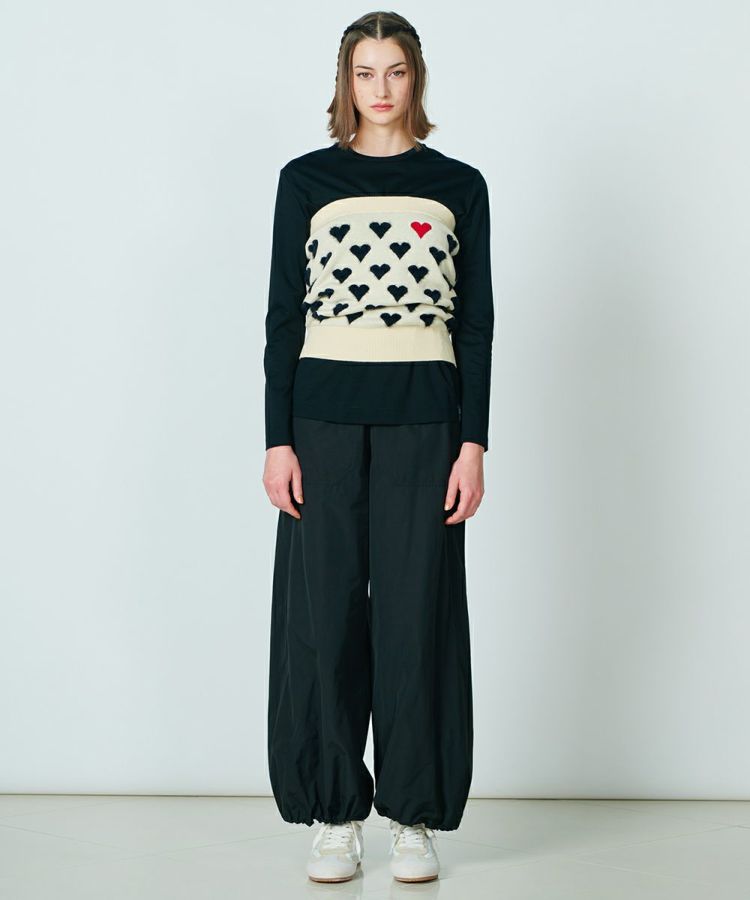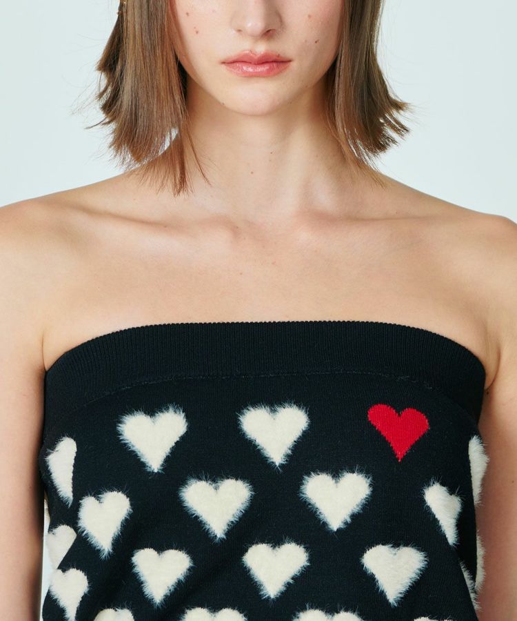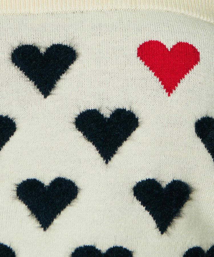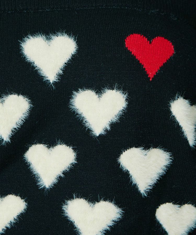 シャギーモヘアのハートがキュートな、ニットトップス。肌あたりが抜群に気持ち良く、一枚でもレイヤードアイテムとしても活躍します。バストとウエストはリブにすることで、メリハリが出るのもポイント。ポップでありながら、シックなボトムと合わせても大人かわいくコーディネートできます。