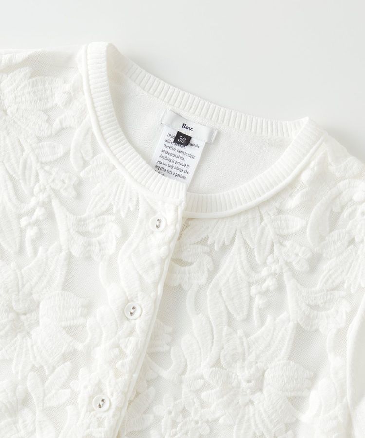 フロントにレースを配した、上品な佇まいのニットカーディガン。華やかさがありながらも主張しすぎず、いつものコーディネートにさっと取り入れやすい一枚です。カラーは、使い勝手の良いオフホワイトとブラックに、差し色として映えるピンクを加えた3色展開。薄手の素材感なので、春先のレイヤードスタイルはもちろん、夏の冷房対策にも活躍します。