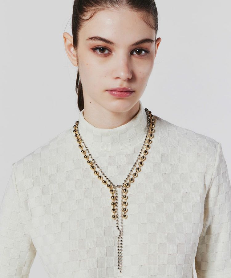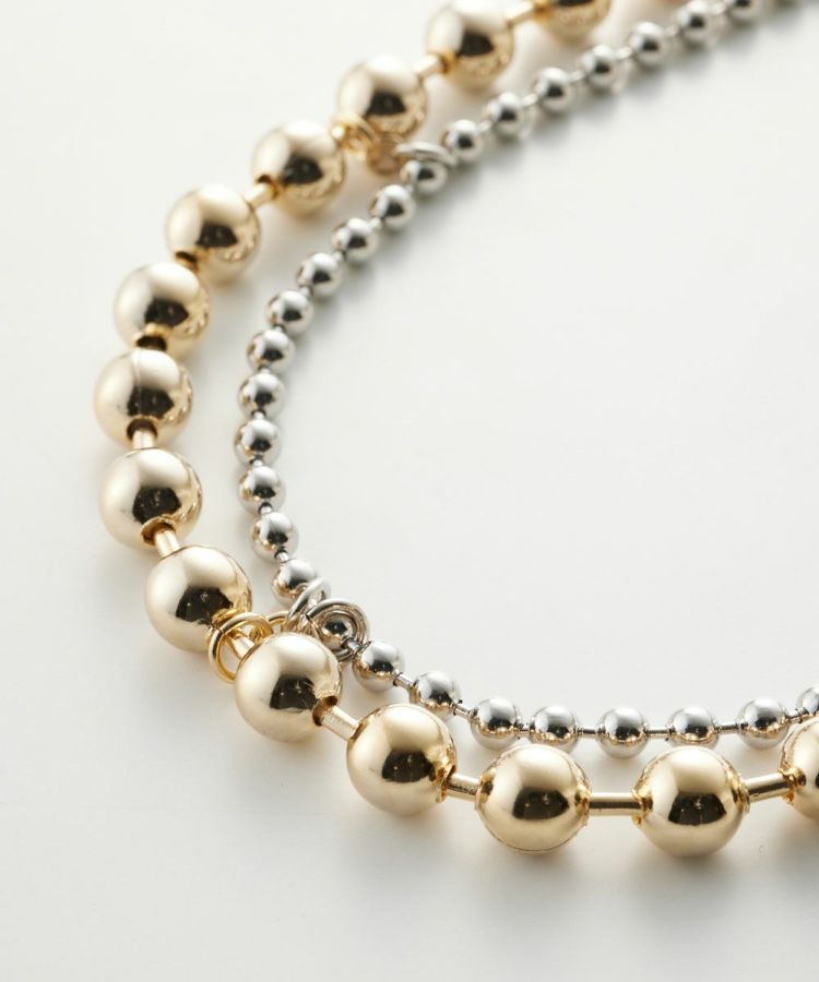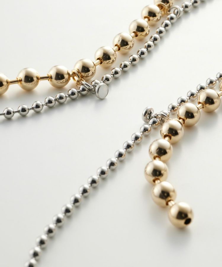 大きなゴールドと小さなシルバーのボールチェーンを組み合わせたネックレス。異なるサイズでリズミカルな動きをつけることで、軽やかなラリエットに仕上げました。前後を逆にして二連ネックレスとして楽しむのもOK。カジュアルからパーティーなどのオケージョンまで、さまざまなシーンで華を添えてくれるアイテムです。