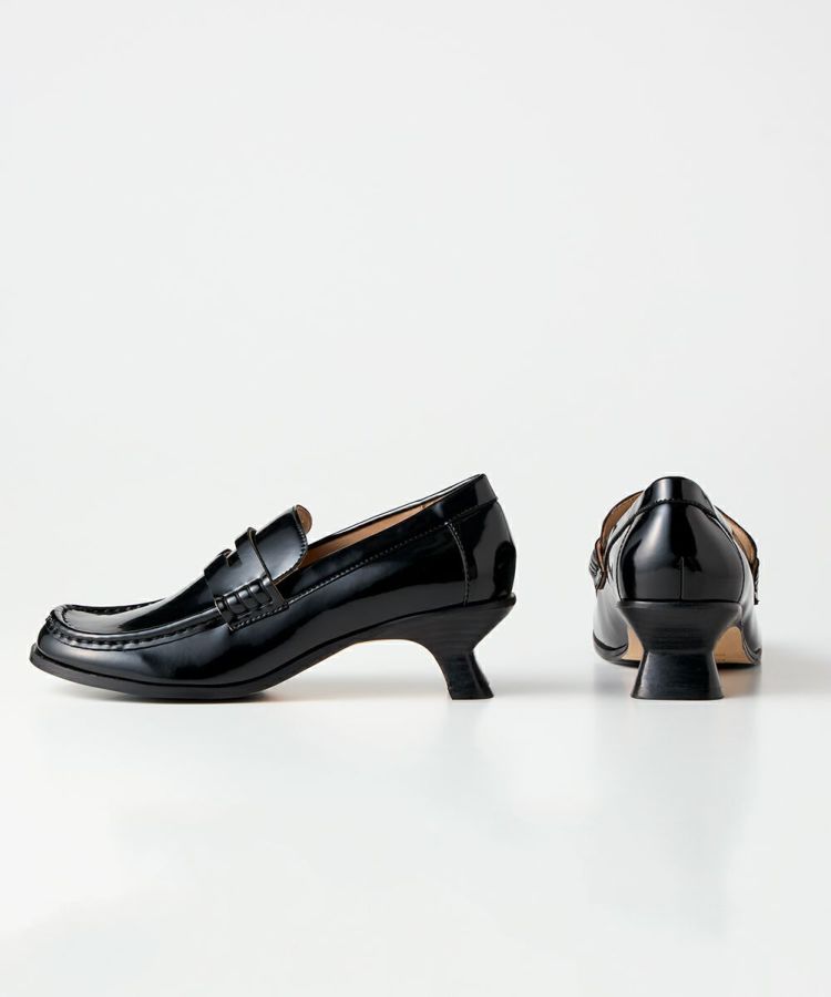 マニッシュな印象を与えるローファーに、ヒールをプラス。トゥは甲を薄く仕上げることでゴツくなりすぎず、デザイン性がありながらも女性らしく履けるのがポイントです。表面はエナメルではなくガラス調の素材を使用しているため、マットで高級感が漂う一足。ヒールで足長効果も狙えるため、すっきりとスタイリッシュなコーディネートを叶えてくれます。