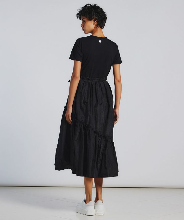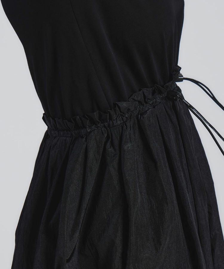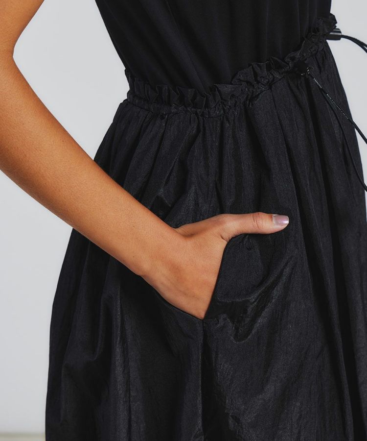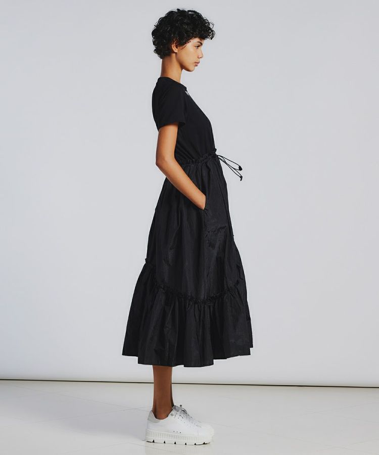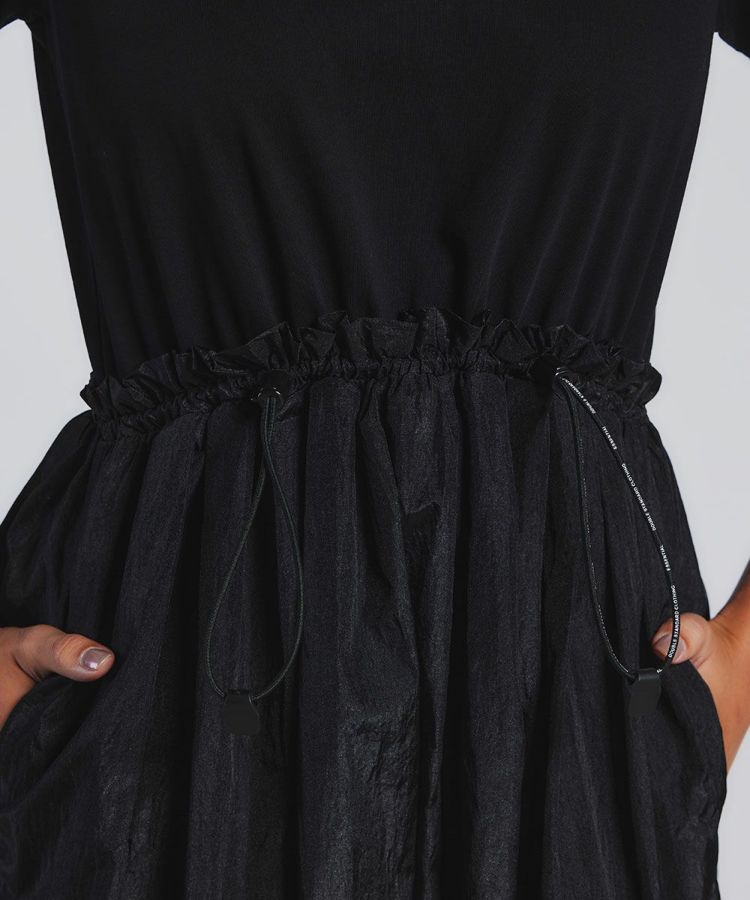 しっかりとした厚みとハリのあるポンチ素材のTシャツと、シャイニーナイロンのタフタ生地をたっぷりと使用したスカートをドッキング。異素材の組み合わせはもちろん、コンパクトなトップスとボリューミーなボトムのメリハリのあるシルエットで、着映え力抜群の一枚に仕上げました。ウエストにはオリジナルゴムのスピンドルが入り、細やかなキュービックプリントがさりげないアクセントに。ウエスト高でスタイル良く見せてくれるのもうれしいポイントです。