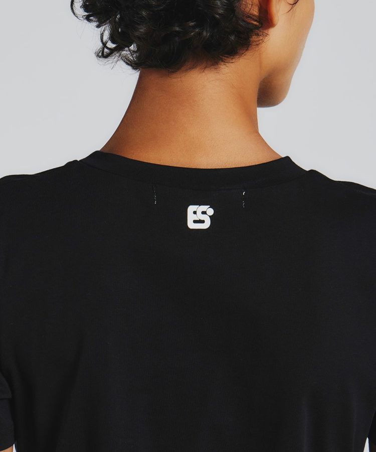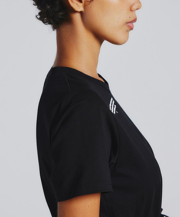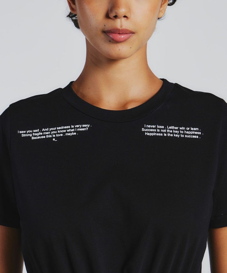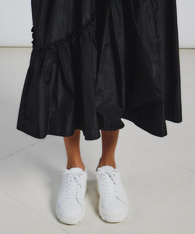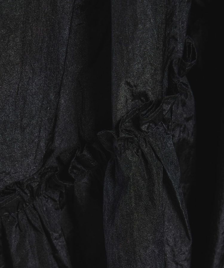 しっかりとした厚みとハリのあるポンチ素材のTシャツと、シャイニーナイロンのタフタ生地をたっぷりと使用したスカートをドッキング。異素材の組み合わせはもちろん、コンパクトなトップスとボリューミーなボトムのメリハリのあるシルエットで、着映え力抜群の一枚に仕上げました。ウエストにはオリジナルゴムのスピンドルが入り、細やかなキュービックプリントがさりげないアクセントに。ウエスト高でスタイル良く見せてくれるのもうれしいポイントです。