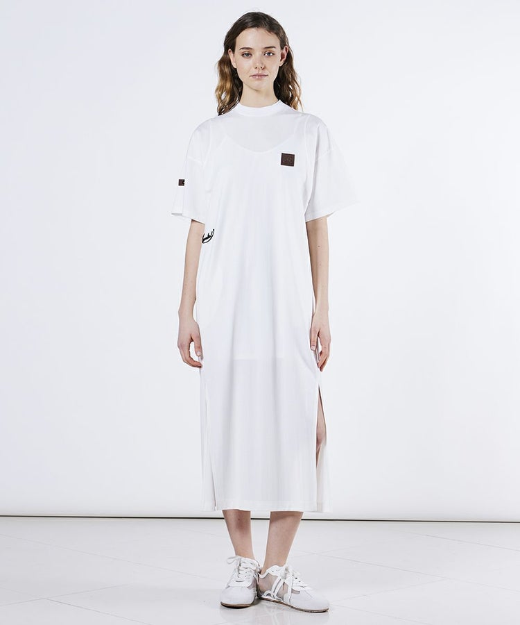 暑い季節でも軽やかに着こなせるラフなワンピース。背中のロゴプリントが、スポーツライクなアクセントになっています。高ストレッチ性を備えた素材を使用しているため、長時間着用しても着心地も楽ちん。程よい透け感と深めのスリットが、さりげない女性らしさを演出してくれます。1枚でサマになるワンピースは、何枚あっても重宝すること間違いなし。