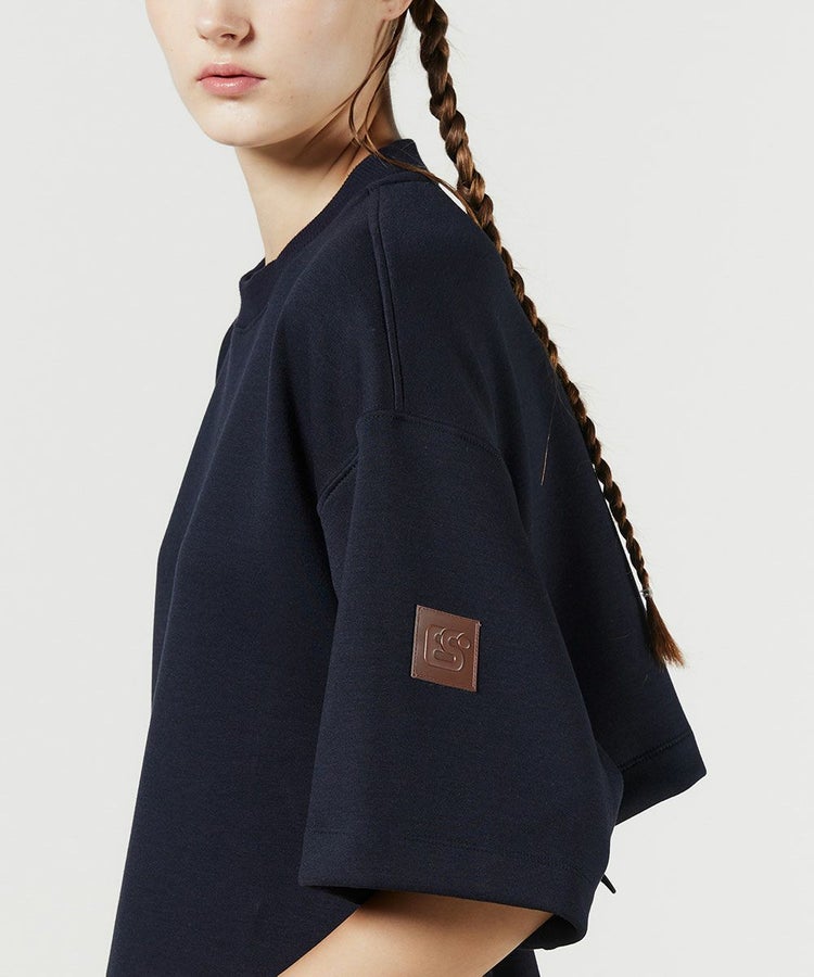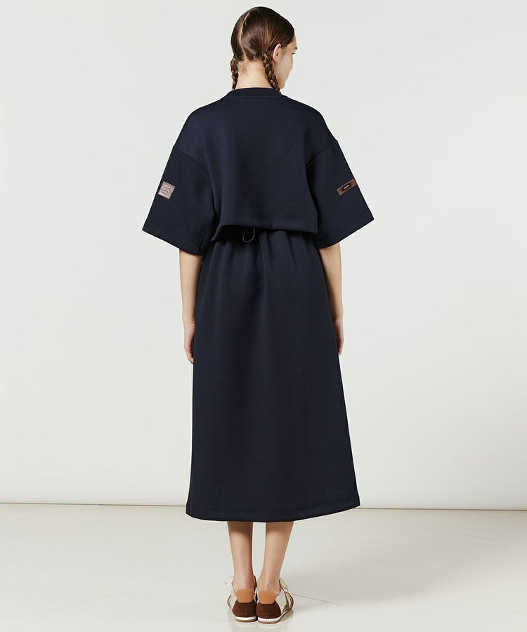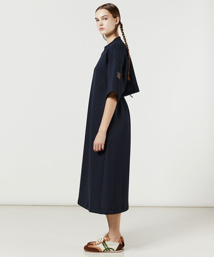 ワイドシルエットでありながら、バックにスリットを入れてメリハリを出したワンピース。程よいハリ感のある裏毛素材が立体的なフォルムを出してくれるため、スポーティーでありながらモダンに着られるのが魅力です。二の腕を自然にカバーしながら、手元をすっきり見せてくれるのもうれしいポイント。袖に施したロゴパッチも高級感のあるアクセントになっています。