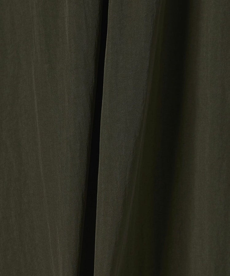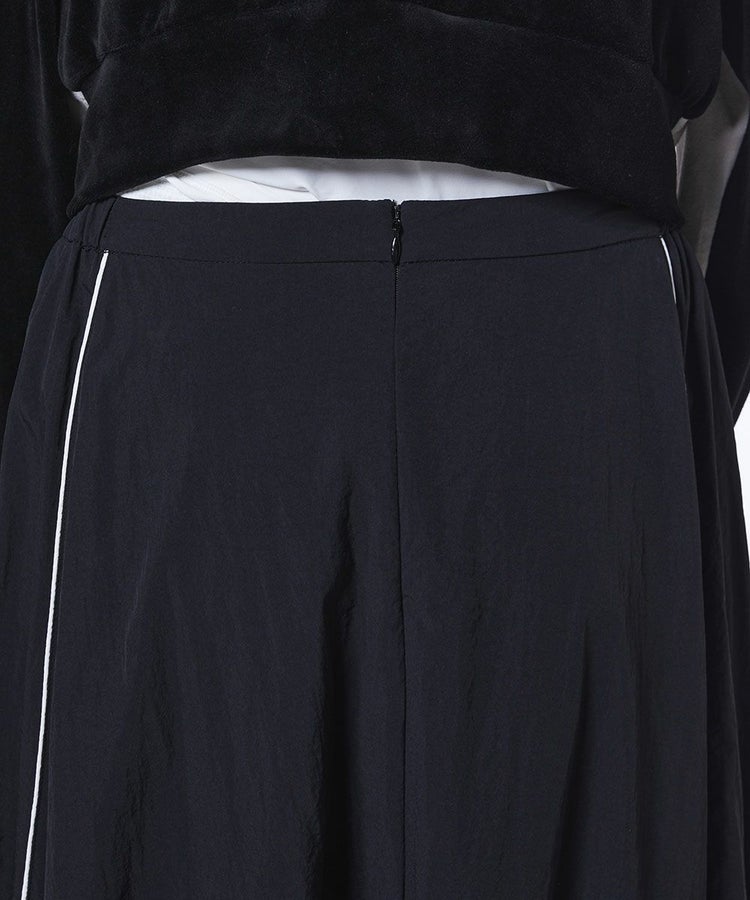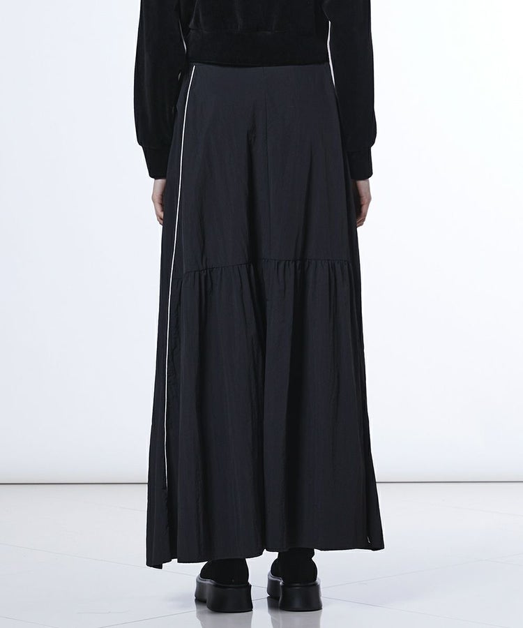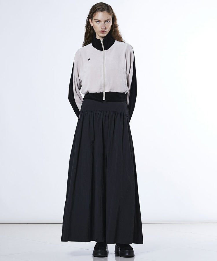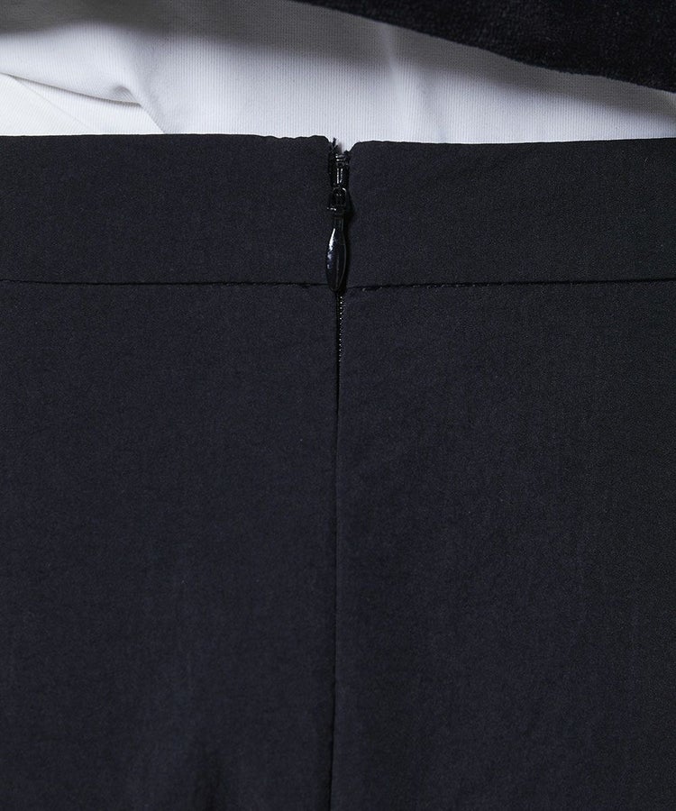 光沢感と美しいドレープが際立つナイロンタフタ素材を用いたスカート。軽やかで耐久性・撥水性にも優れ、機能性とファッション性を兼ね備えました。スポーティーな素材感でありながら、裾に向かって広がるフレアシルエットが女性らしさを引き立て、コーディネートに華やぎをプラス。ショート丈のトップスを合わせればバランス良くスタイリングが決まります。
