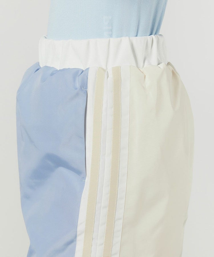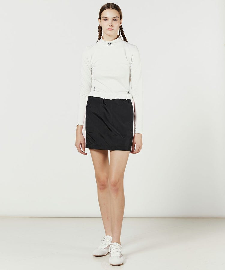 パステルカラーと配色デザインが特徴になったミニスカート。さらっとした質感はもちろん、サイドに入ったラインがスポーティーなムードたっぷりです。ウエストはサイドジップでストレッチのきいたインナーパンツ付きとミニスカートでも安心して着用できる設計に。コンパクトなトップスだけでなく、大きめのパーカーをざくっと羽織ってもかわいく決まります。バイカラーに仕上げたトラックジャケットとセットアップで楽しみたい。