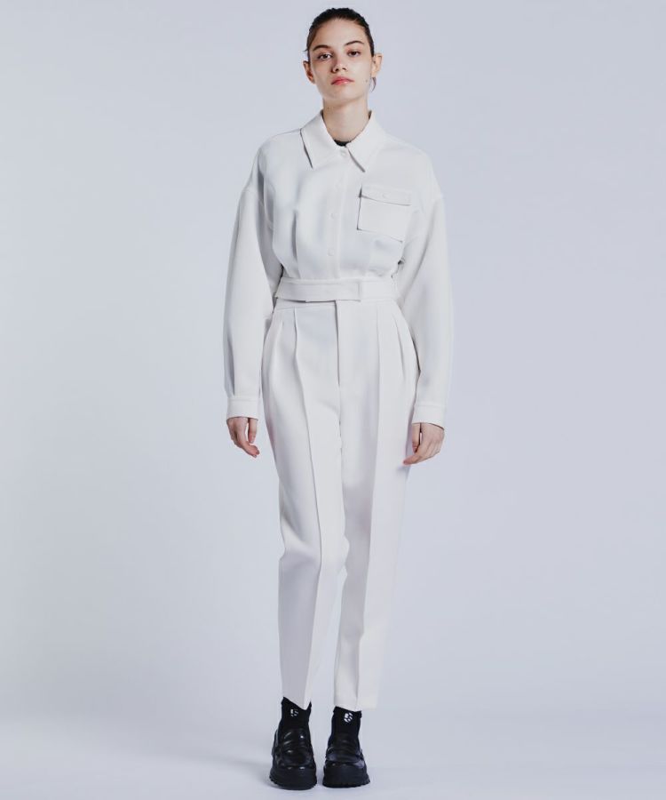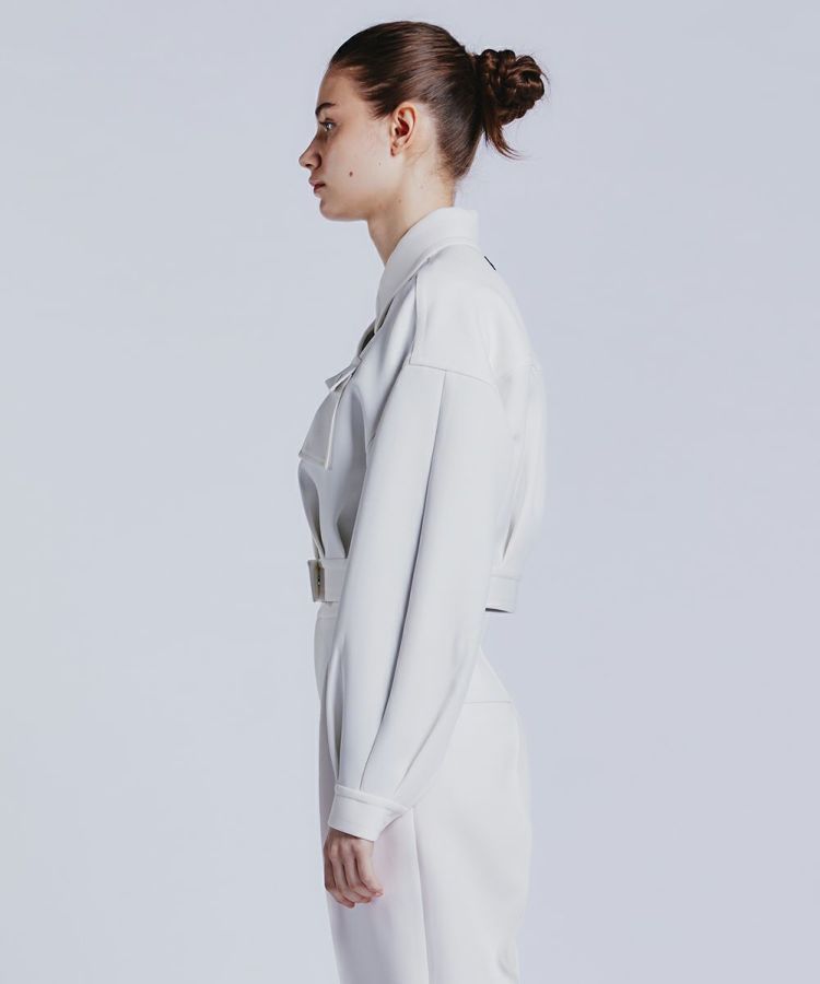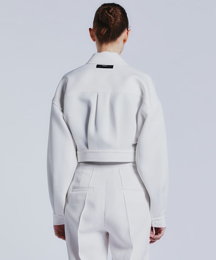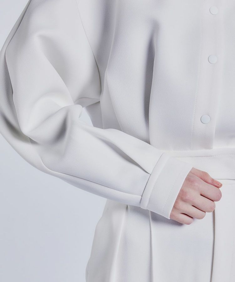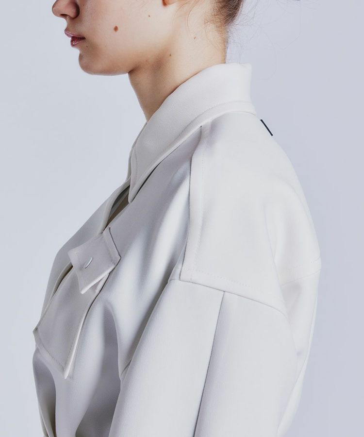 コーディネートにプラスするだけでスタイルアップ効果が狙える、ショート丈のシャツアウター。まるでボンディングしたようなふくらみ感が、一枚の生地で表現されています。アセテートとポリエステルの交織により、ハリ感をだしながらもソフトなふくらみ感と高級感を実現。ショート丈と立体感がスタイルにモードなエッジをプラスしてくれること間違いなしです。ミニマムなデザインで、着まわし力も抜群!