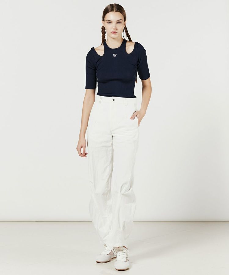 どこか懐かしさのある、バルーンシルエットがかわいいパンツ。タックとバックの絞りのギミックで立体的に仕上げることで野暮ったくならず、現代的に着用できるよう仕上げました。ハイウエストなのもポイントで、トップスをインしてもしなくても、コーディネート全体のシルエットにメリハリが出るのが魅力。ベーシックなカラーなので着まわし力も抜群です。