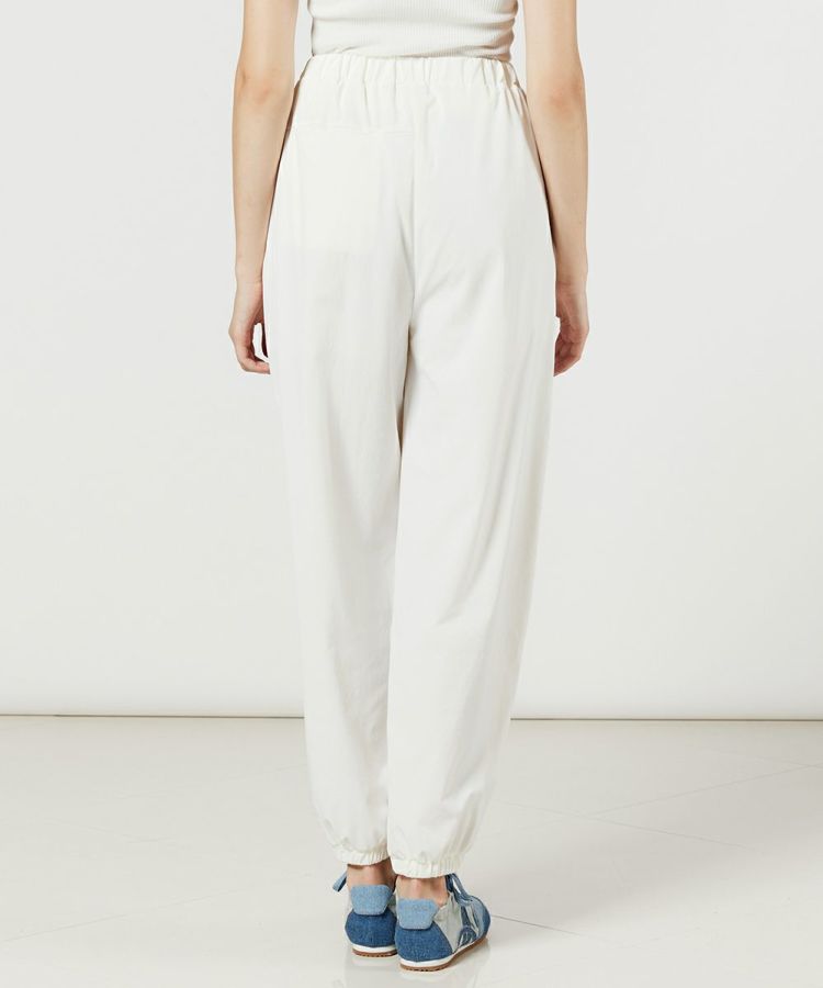 軽やかな着心地とルックスを兼ね備えた、ナイロン素材のパンツ。ストレッチ性と撥水性に優れており、機能性も抜群です。ウエストは高めに設定し、足元は絞りのデザインですっきりと穿きこなせるデザインに。同色の糸で施したオリジナルのエンブレムがさりげないアクセントになっています。
