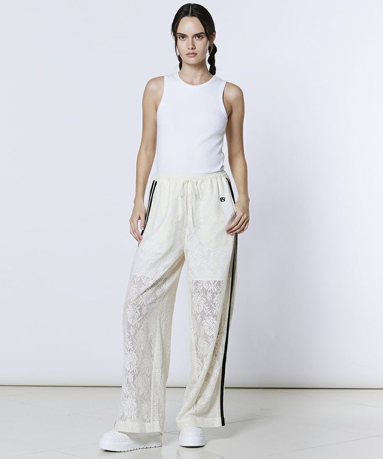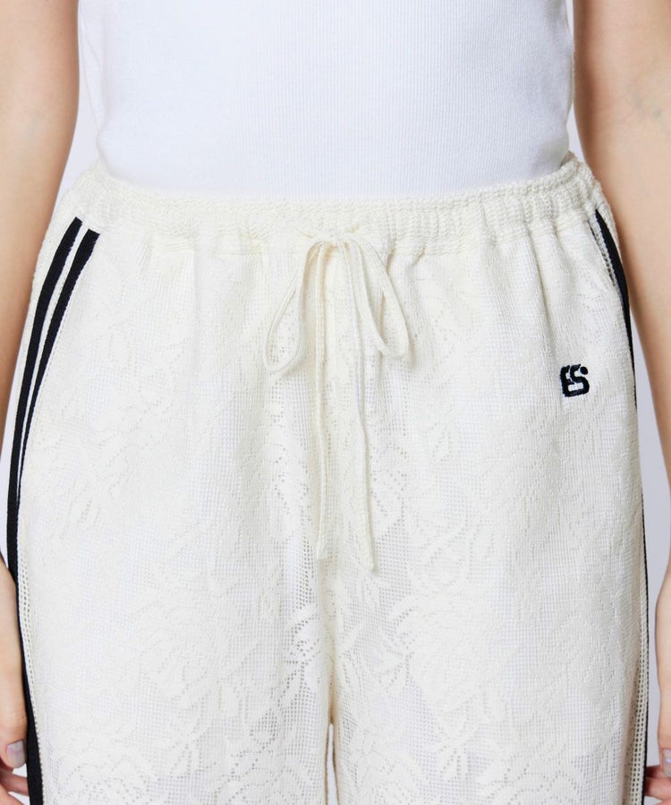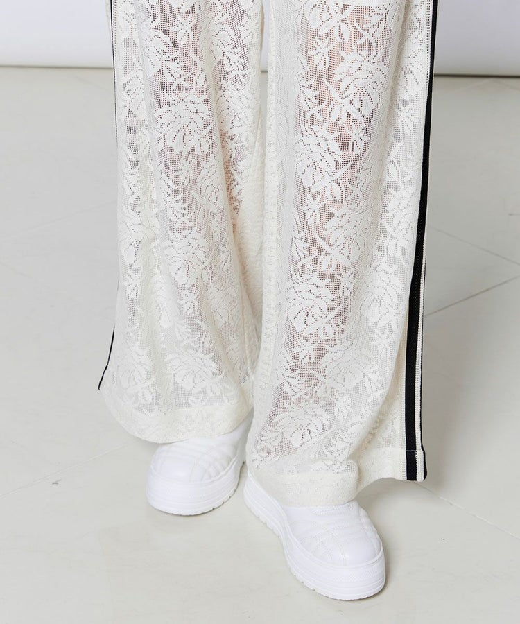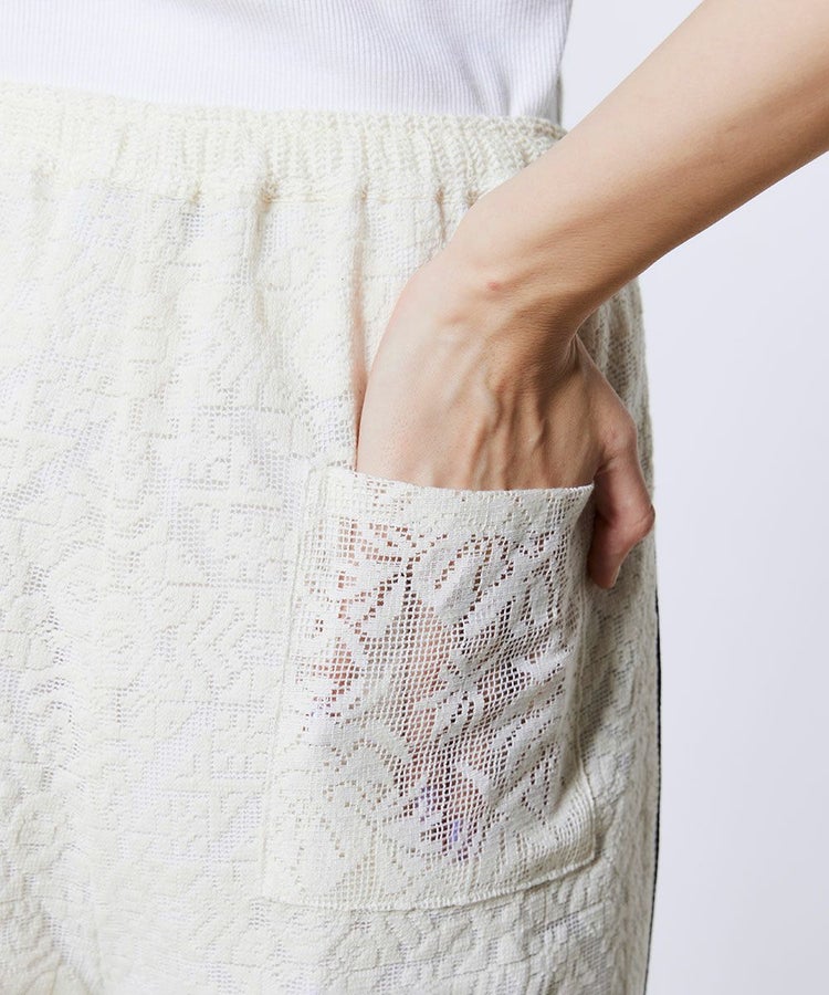 クラシカルな総レースが、程よい透け感でセンシュアルなムードを演出するパンツ。サイドにはブラックのラインを配し、スポーティーなエッセンスをさりげなくプラスしました。軽やかなレース素材が、女性らしい柔らかさと抜け感を添える一着。同素材のシャツ(型番:2504270261)と合わせれば、洗練されたセットアップスタイルを楽しめます。