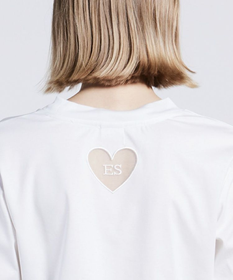 超長綿の糸をハイゲージスムースで編み立てたトップス。ニットとは思えないほどしっかりと均一に編んだ表面は、丈夫で繊細、かつエレガントな印象を与えてくれます。また、バックスタイルには透け感のあるオーガンジーの刺繍がキュートなアクセントをプラス。変形の裾も印象的で、シンプルながらもデザイン性の高い一枚です。