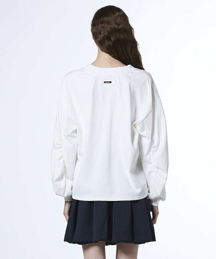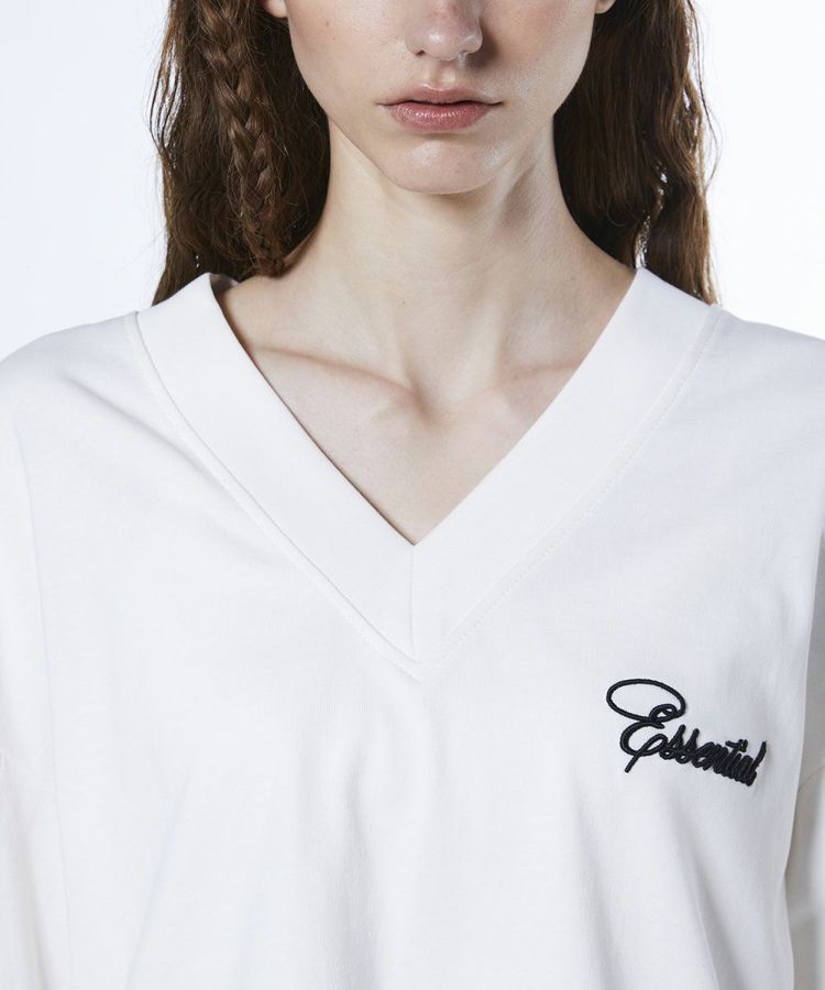 Vネックがデコルテラインを美しく引き立てるトップス。上質なコットンの天竺編み素材を使用し、ほどよいハリ感で上品な印象に仕上げました。耐久性にも優れており、洗濯を繰り返しても風合いを保てるのが嬉しいポイント。袖に施したギャザーがさりげないアクセントとなり、ゆったりとしたシルエットがリラクシンなムードを演出します。