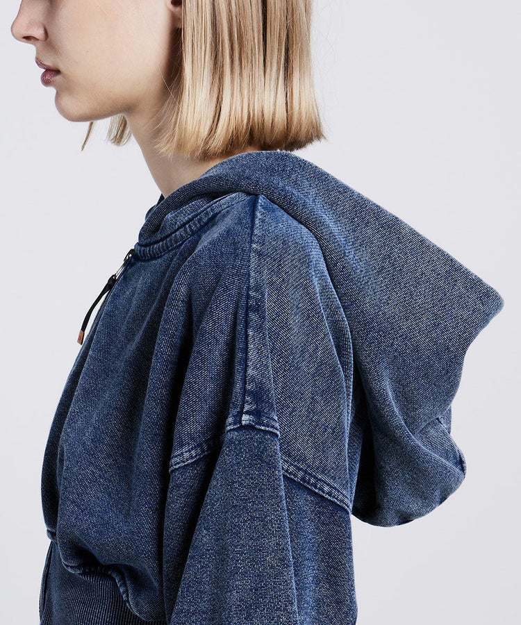 インパクトのある加工が目を引くパーカー。しっかりとした裏毛素材をインディゴ染めし、あえてムラバイオウォッシュ加工を施しました。ショート丈×ボリューム袖のシルエットが、コーディネートにエッジをプラス。また、スタイルアップを叶えてくれます。加工生地の程よい落ち感があるため、ヴィンテージのような風合いと大人っぽいこなれ感を演出してくれるのも魅力です。