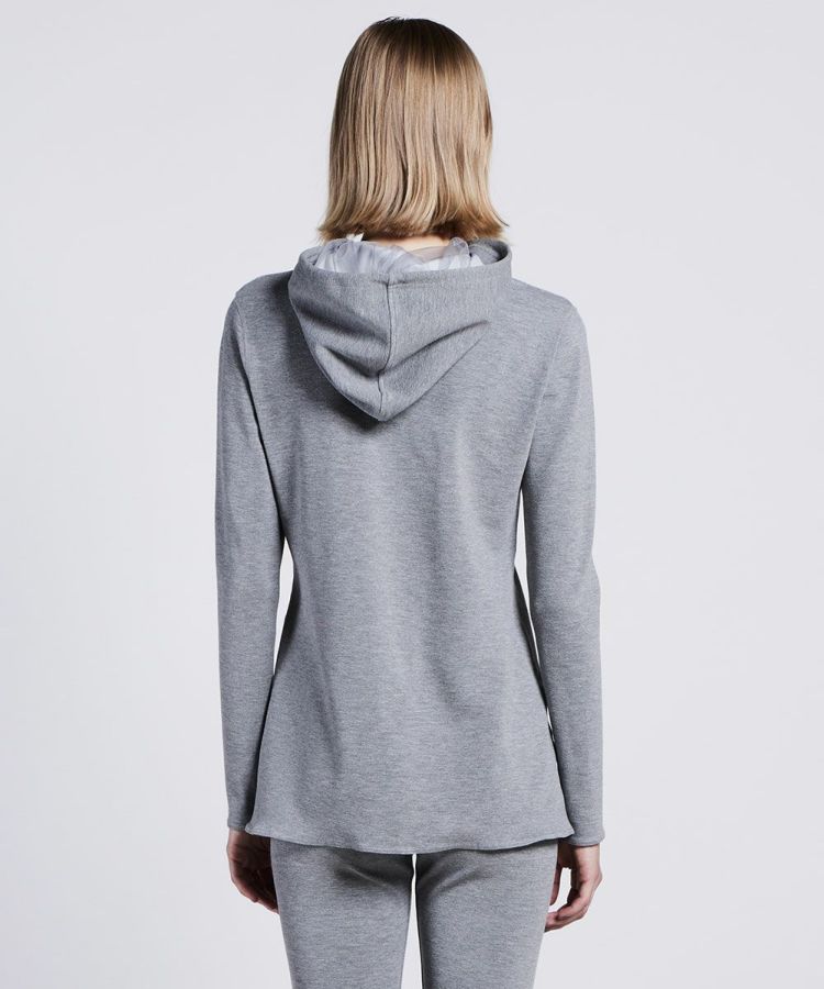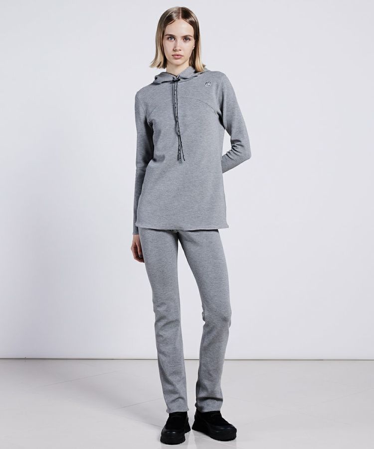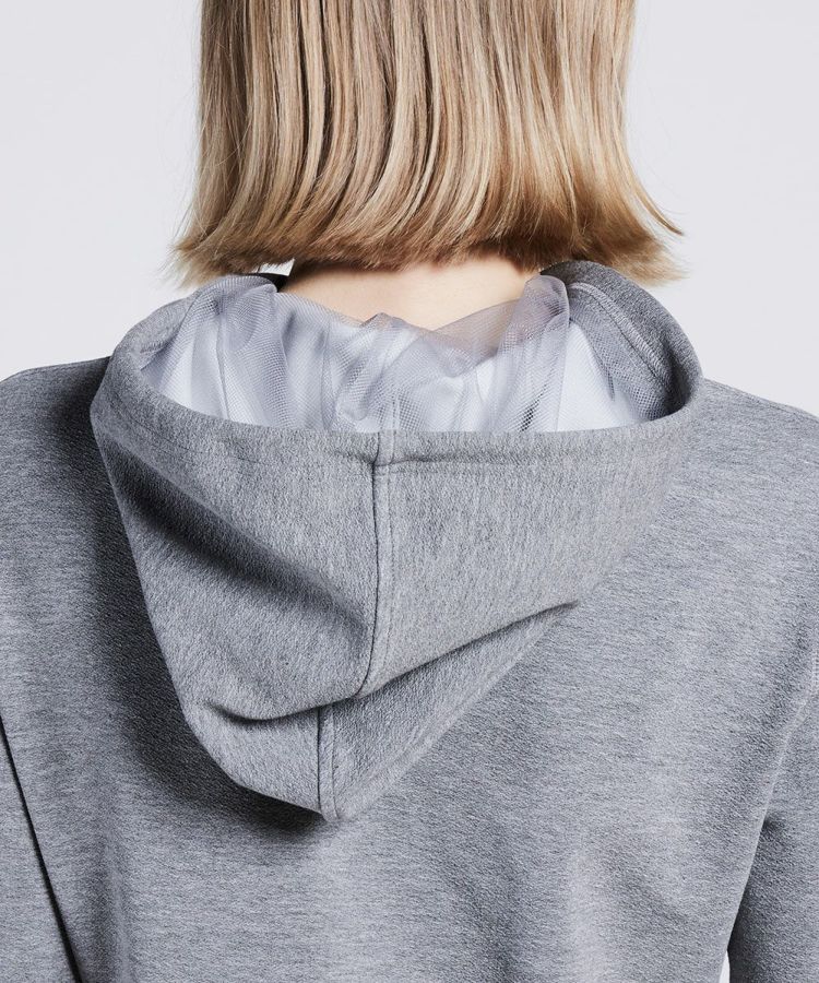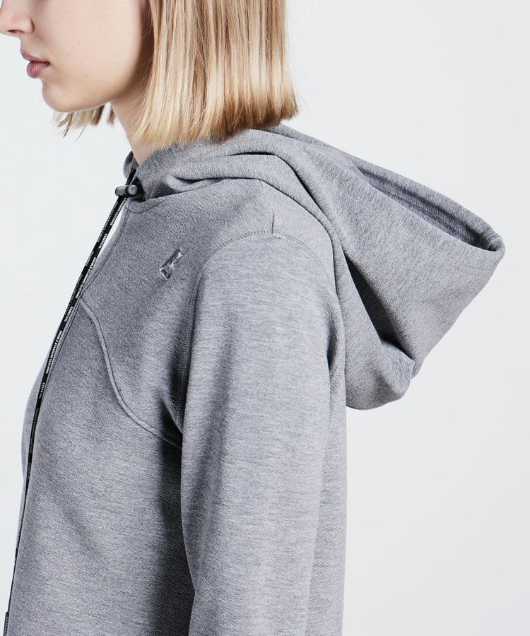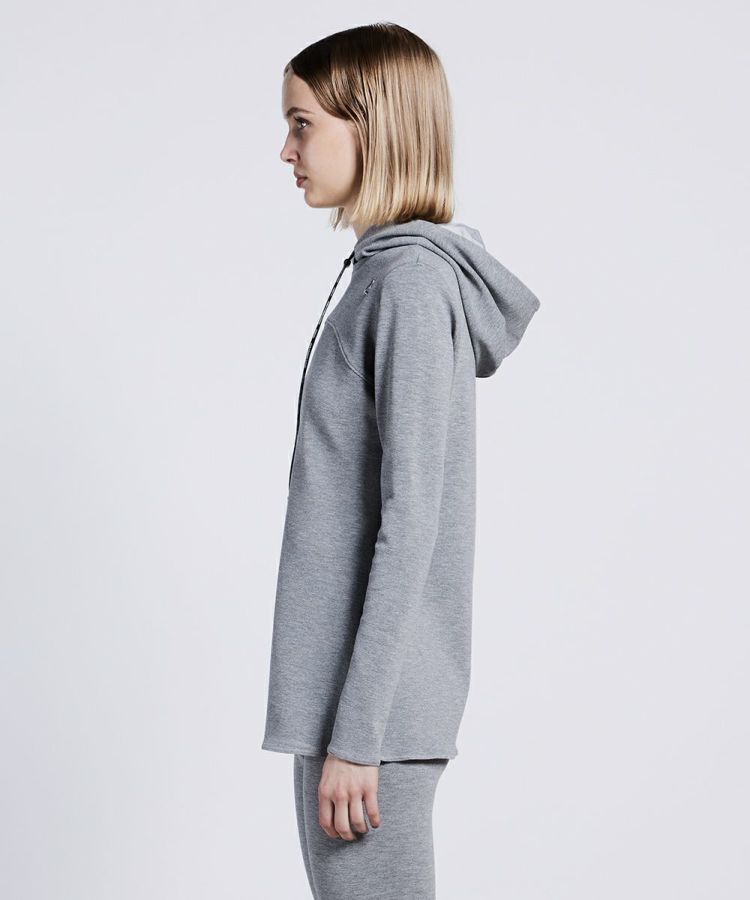 タイトなシルエットで着やせ効果のあるトップス。コンパクトながらもストレッチ性に優れており、着心地は抜群です。フードもコンパクトで、ミニマムなデザインが上品な印象に。オリジナルのスピンドルとストッパー、裾の千鳥仕上げや同色でまとめた刺繍ががさりげないアクセントになっています。