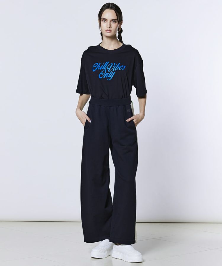 バックスタイルに大胆なカッティングを施し、さりげない肌見せを楽しめるTシャツ。フロントには英文字グラフィックを配し、シンプルな中にアクセントを効かせました。ショート丈のバランスが取りやすいシルエットで、さまざまなボトムスと好相性。デザイン性のある一枚は、同系色のボトムスと合わせた統一感のあるスタイリングもおすすめです。