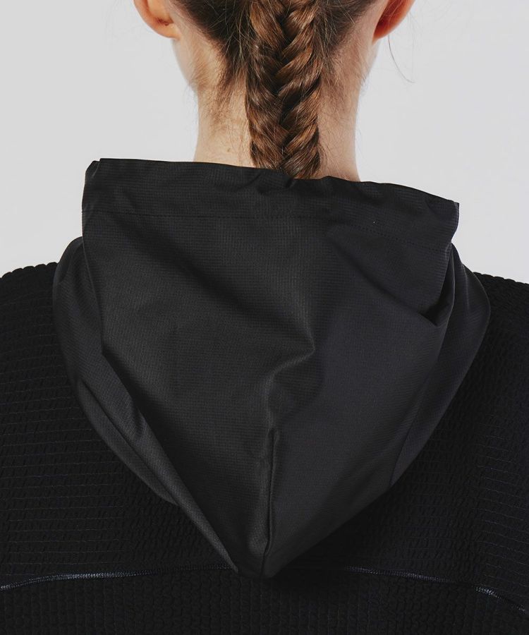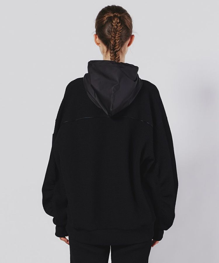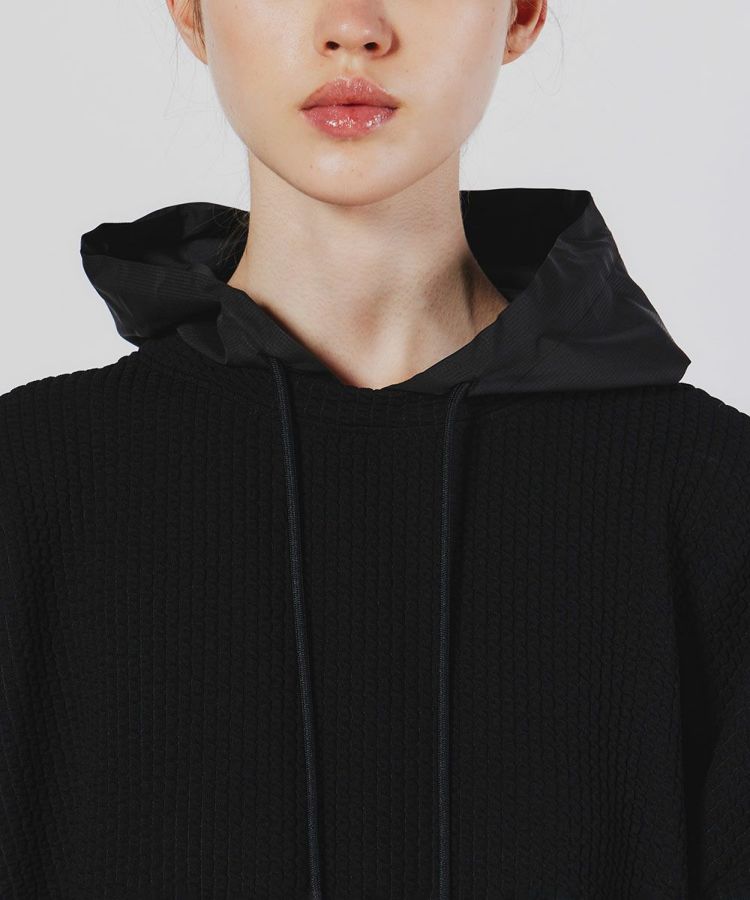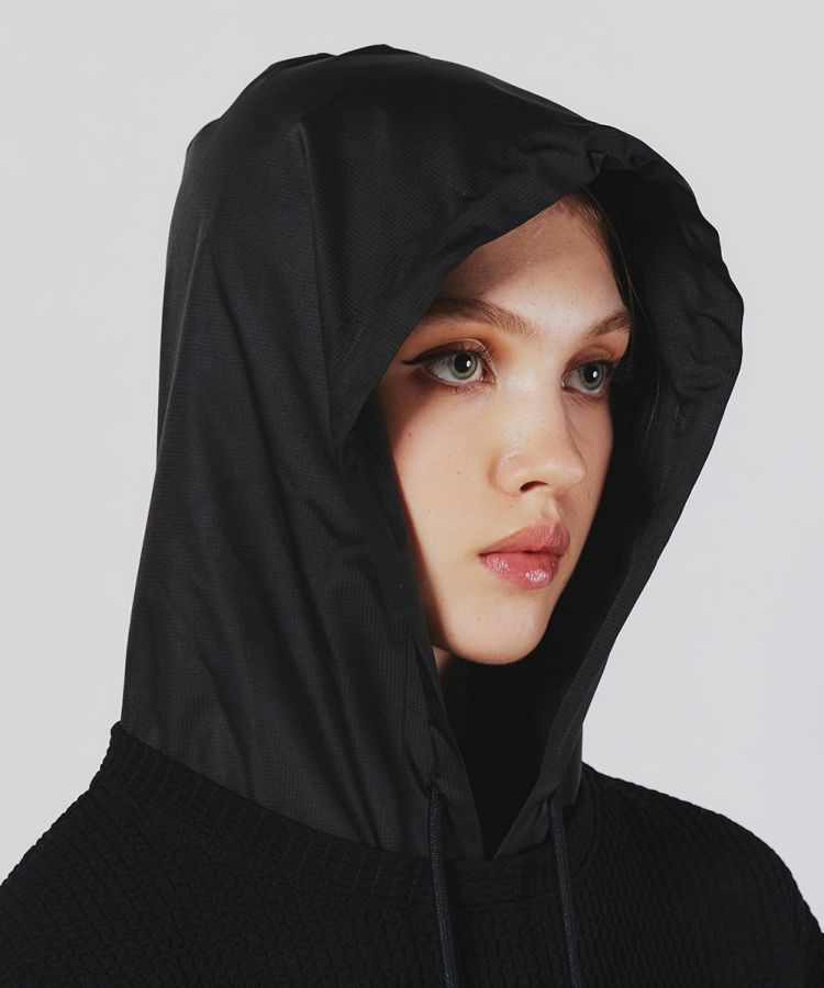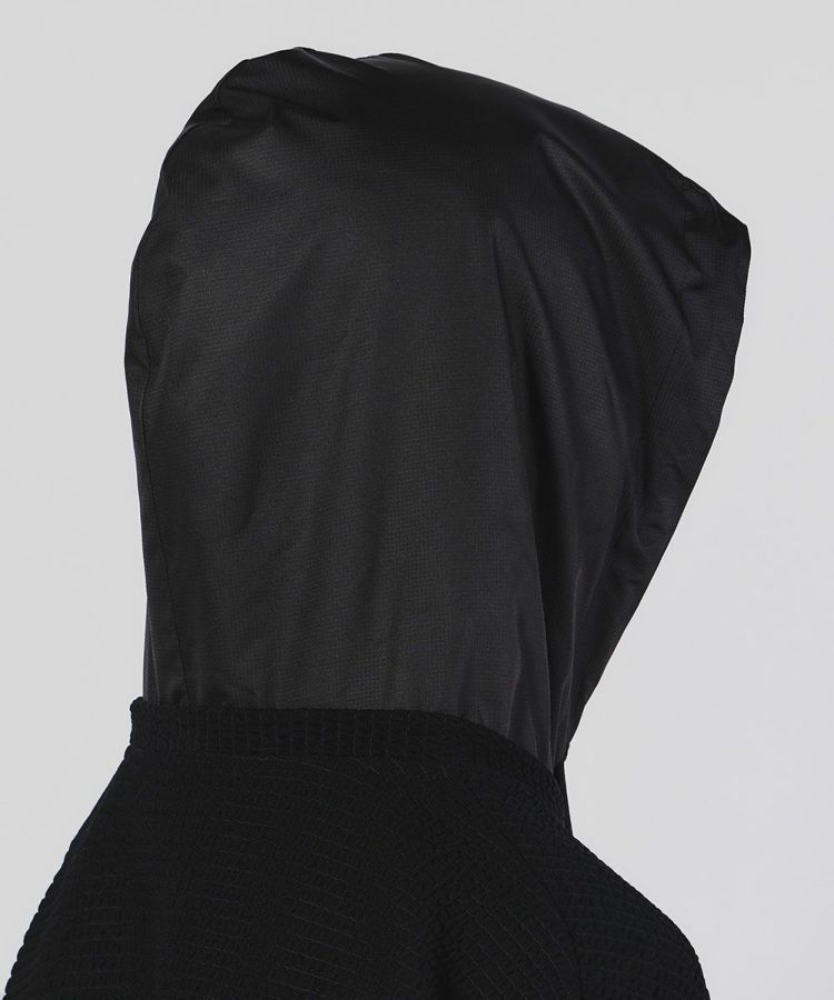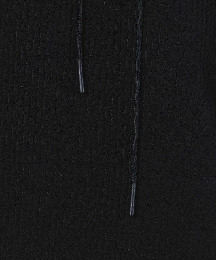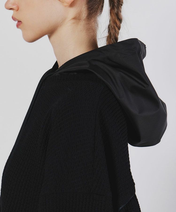 使い勝手の良いミドル丈のフーディー。自然な質感でふくらみのあるポリエステル糸とポリウレタンをポリでカバーリングした伸縮性のある糸を編むことで、生地にストレッチ性を持たせています。また、ポリ素材により発色の良いブラックを実現。リップストップ柄のタフタと絶妙にマッチしています。パイピングのディテールでデザイン性も抜群の一着です。