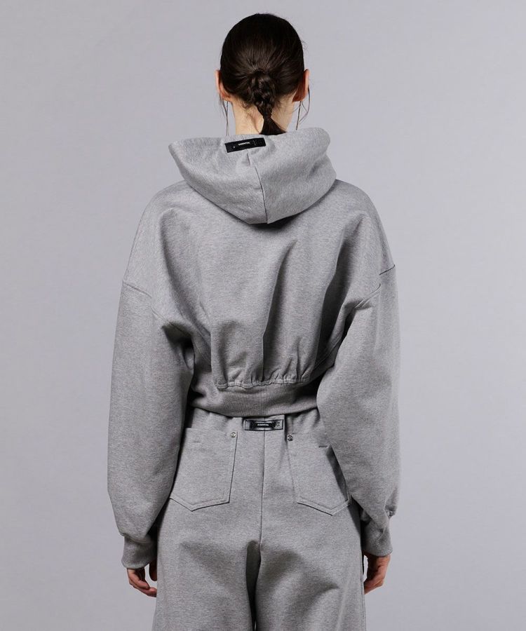 上品な光沢感が魅力的なショート丈のパーカー。裏毛素材にシルケット加工を施すことで、カジュアルな中にも程よいハリ感と高級感をプラスしました。バックには切り替えデザインをあしらい、立体感のある美しいシルエットを演出。ウエスト位置が高く見えるショート丈は、ボリュームのあるボトムスともバランスよく決まり、スタイルアップ効果も抜群です。