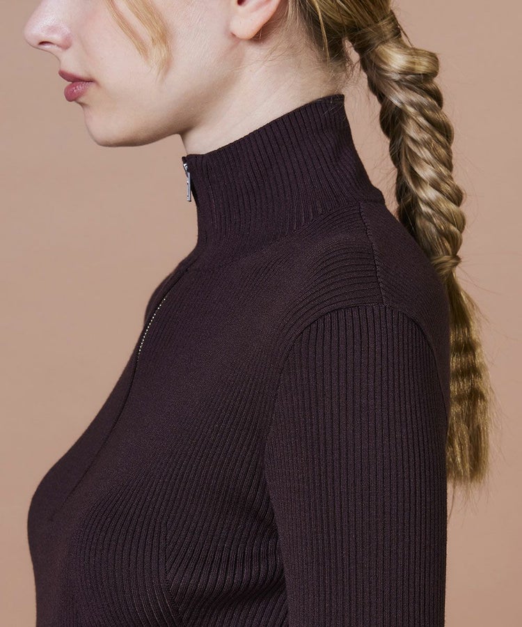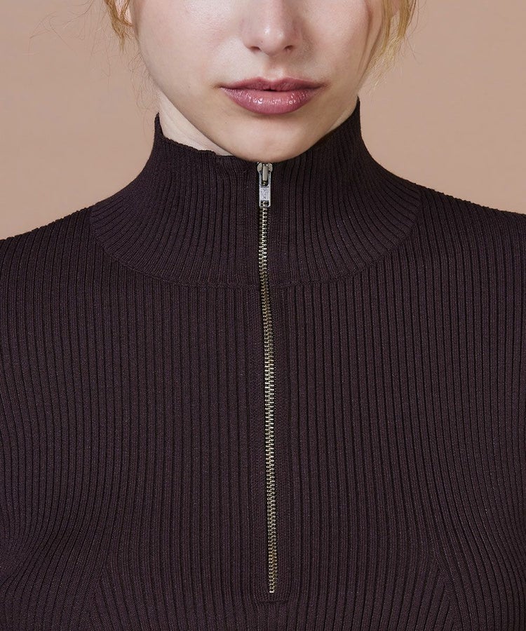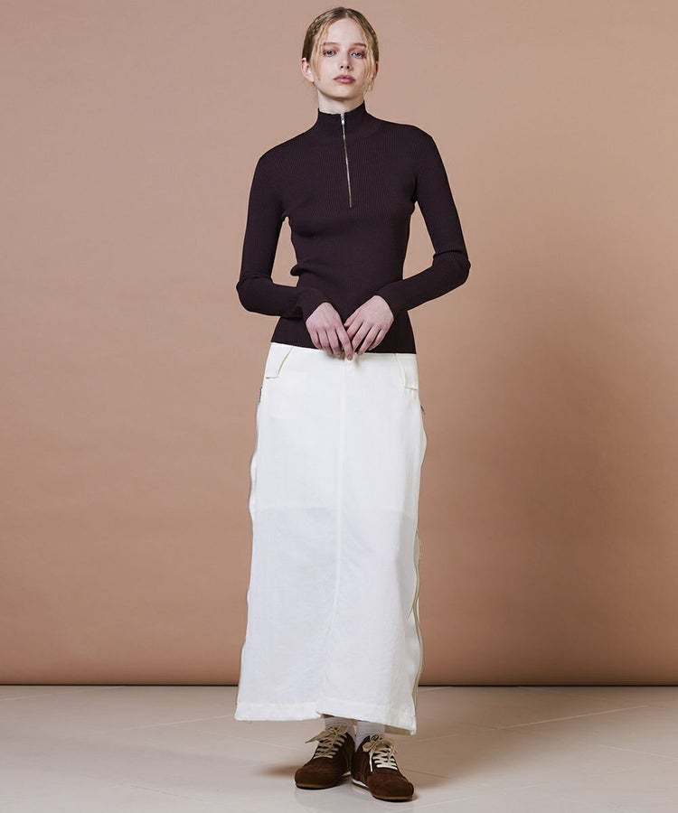 タイトなシルエットが女性らしいラインを引き立てるタートルネック。細やかなリブ編みと上品な光沢感が、さりげなく高級感を演出します。フロントにはハーフジップのファスナーをあしらい、抜け感のあるアクセントに。コンパクトなシルエットはボリュームのあるボトムスとの相性がよく、ロングスカートやワイドパンツと合わせれば、バランスの取れた旬なスタイリングが完成します。