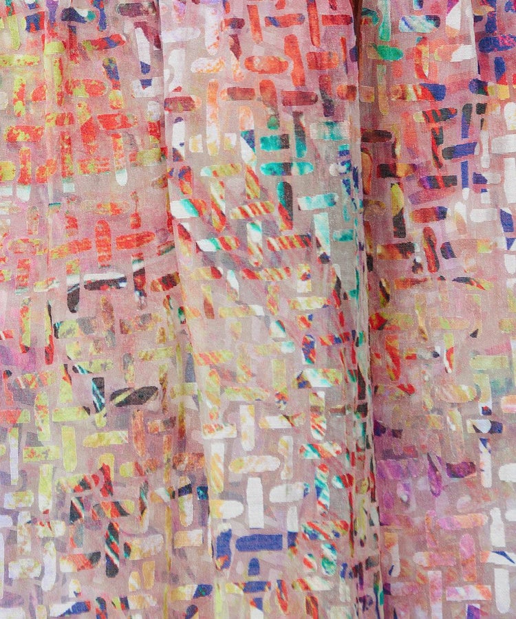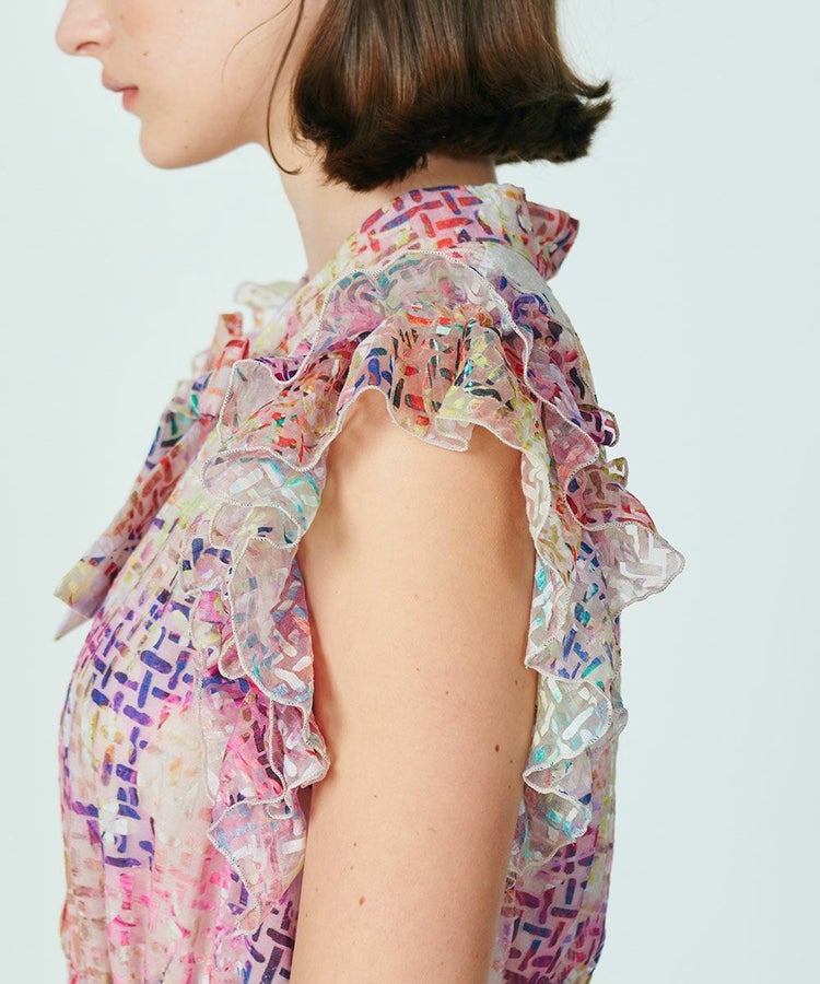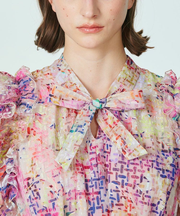 鮮やかなカラーリングと胸元のリボンが華やかなワンピース。腕まわりにボリュームを持たせることで、気になる二の腕をしっかりとカバー。ウエストまわりにはシャーリングを施して、メリハリのあるシルエットにしました。生地にはオパール加工でシアー感をプラスし、奥行きのあるグラフィックに。クラシカルな上品さがあるワンピースに仕上げています。