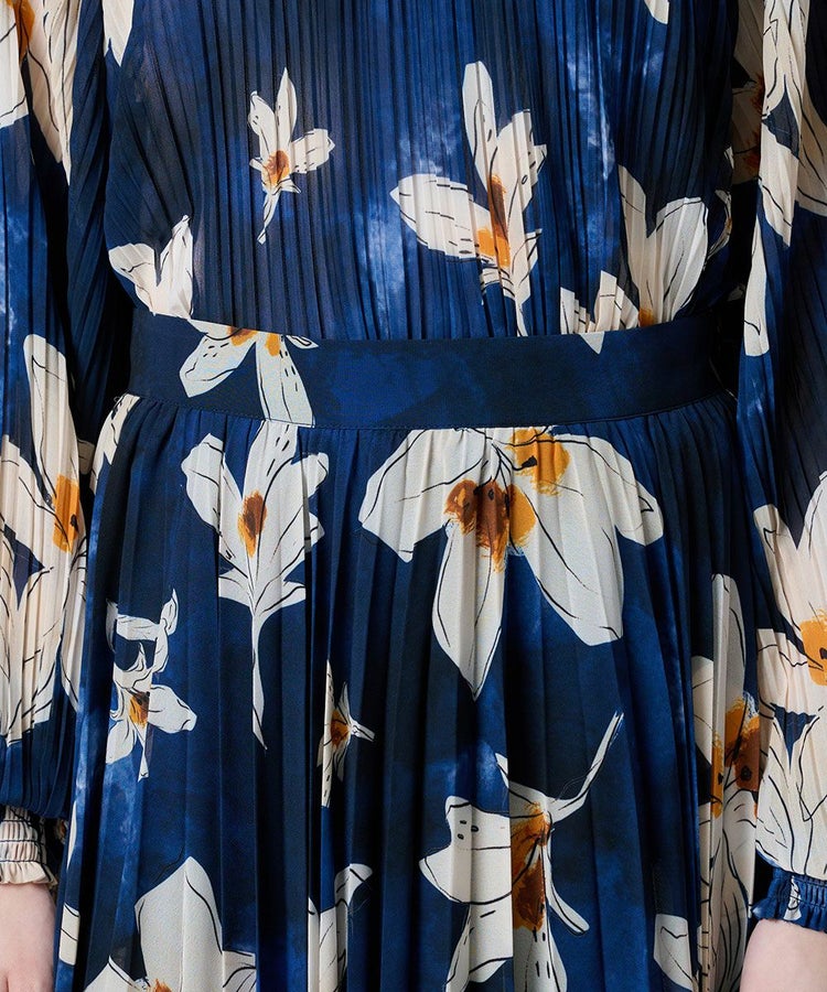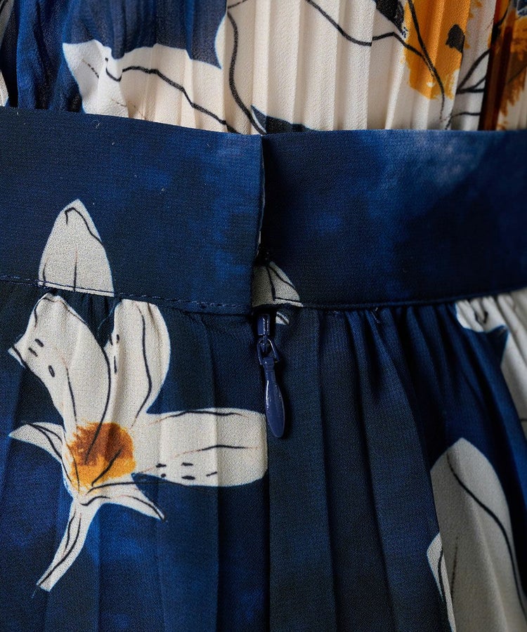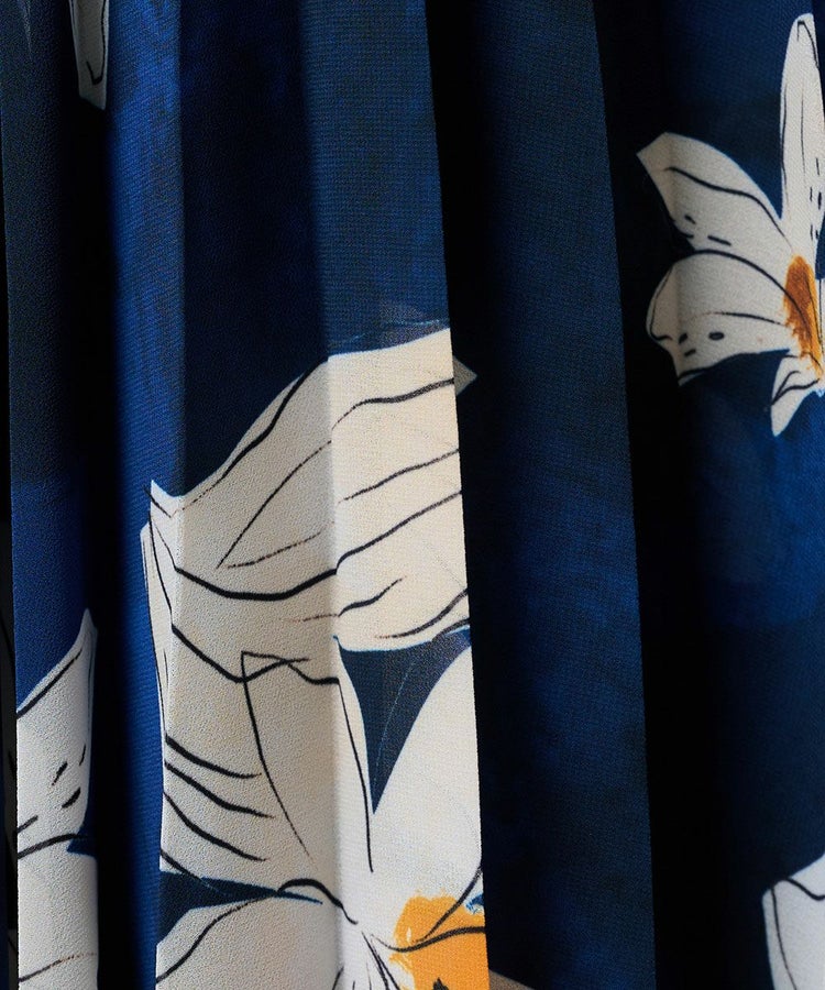 ネイビーとホワイトのコントラストが美しいフラワープリントをあしらったロングスカート。プリーツ加工を施すことで縦のラインを強調し、華やかさの中にもすっきりとした印象を与えます。軽やかなシフォン素材が程よい透け感を生み、上品でエレガントな雰囲気に。同素材のブラウス(型番:3804181261)と合わせれば、統一感のあるワンピース風スタイルが完成します。
