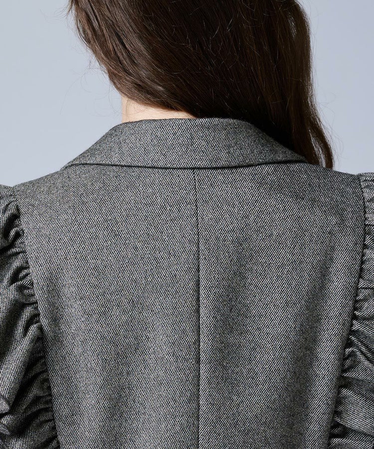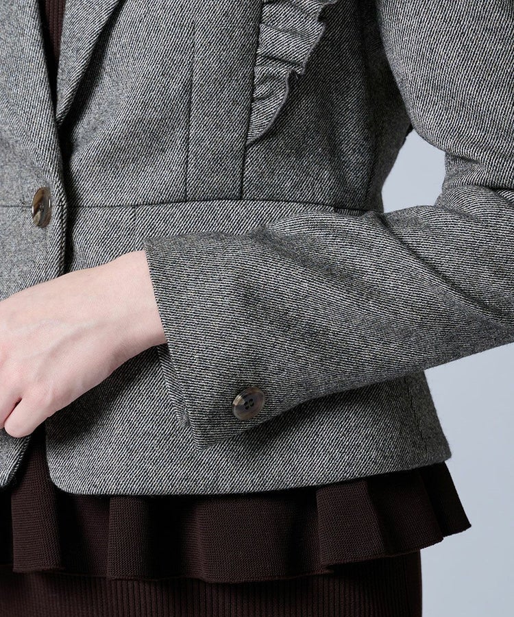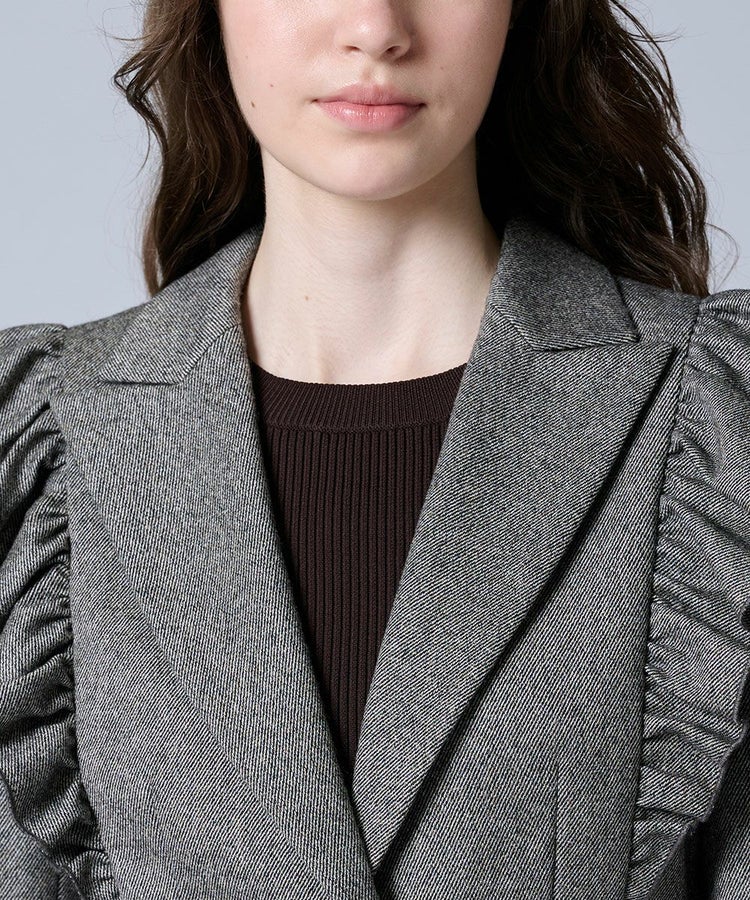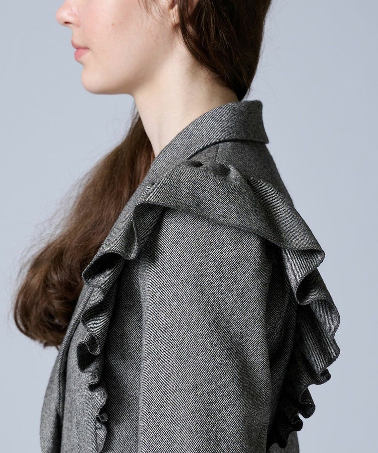 程よい光沢感を放つツイル生地が上品なジャケット。肩から胸元にかけて大胆に施したフリルが、存在感のある華やかさをプラスします。やや短めにデザインされた丈感は、ロングスカートやワイドパンツともバランスよく合わせられるのが嬉しいポイント。羽織るだけでコーディネートをクラスアップしてくれる一枚です。