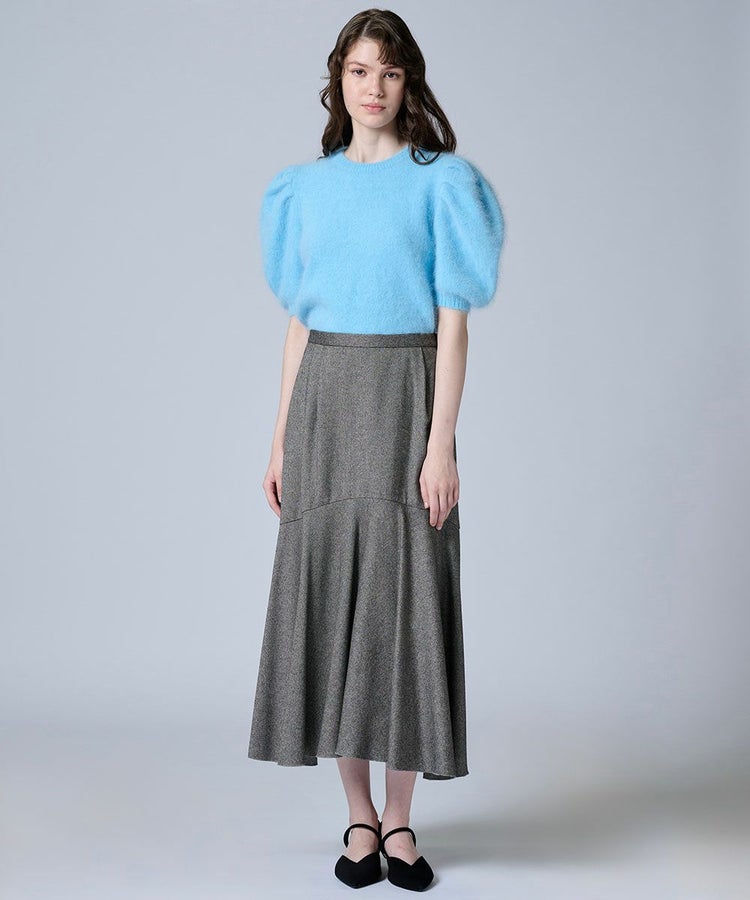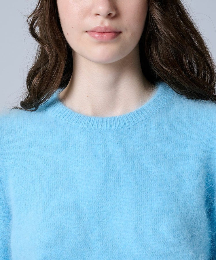 ふわふわとした起毛感とボリュームのあるパフスリーブがフェミニンなニットトップス。軽やかで保温性に優れたアンゴラ素材を使用し、上品な質感を楽しめる一枚です。シンプルながらもあえて半袖に仕上げることで、季節のスタイリングにこなれた雰囲気をプラス。カラーはコーディネートのアクセントになる爽やかなサックスと、落ち着きのあるキャメルの2色展開しています。
