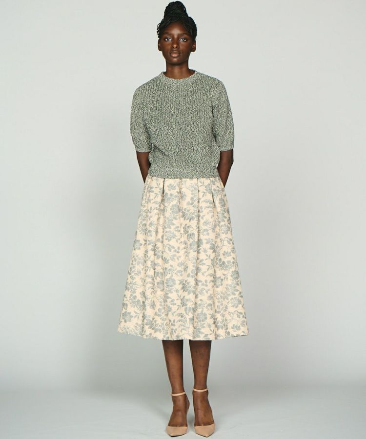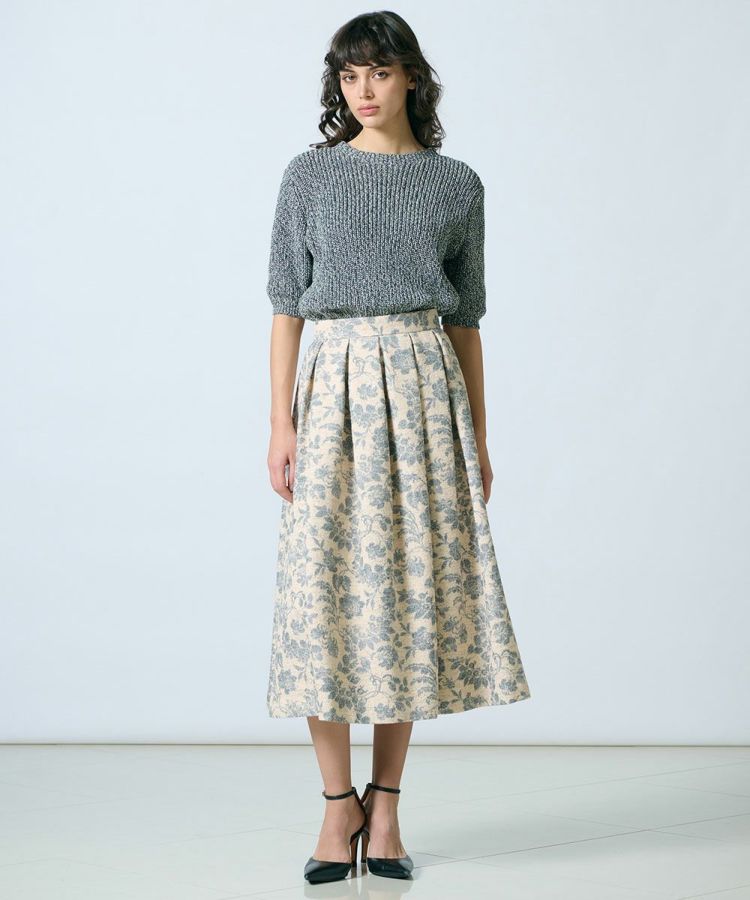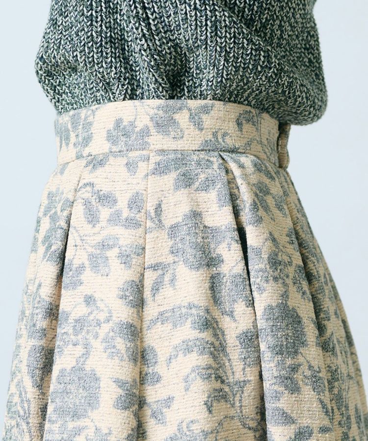 花柄をシックなカラーリングのジャガードで表現したフレアスカート。コットン、ポリエステル、ヴィスコース、麻と、異なる素材を用いたオリジナリティの高い生地は、紡績から仕上げまでを一貫して行うメーカー、イタリア・リチェリ社のものを使用しています。ハリのあるドレープがウエストまわりをカバーしながら、エレガントな雰囲気を演出。これひとつで、おめかし感がぐんと高まるアイテムです。