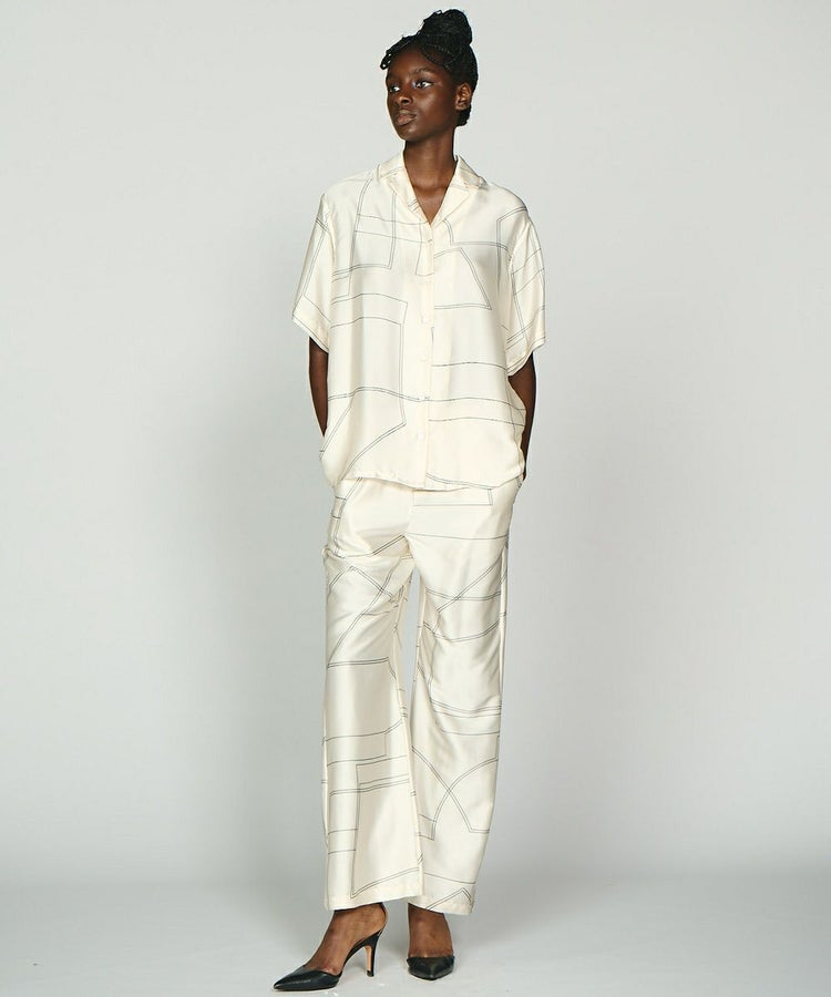 シルク100%の生地に幾何学柄のプリントを施したシャツ。オフホワイトのカラーが爽やかで、上品な印象を与えてくれます。落ち感があるので、シルエットもきれい。リラクシンでありながら、キレイめに着られるアイテムです。天然素材のため通気性がよく、涼しく過ごせるのもうれしいポイント。