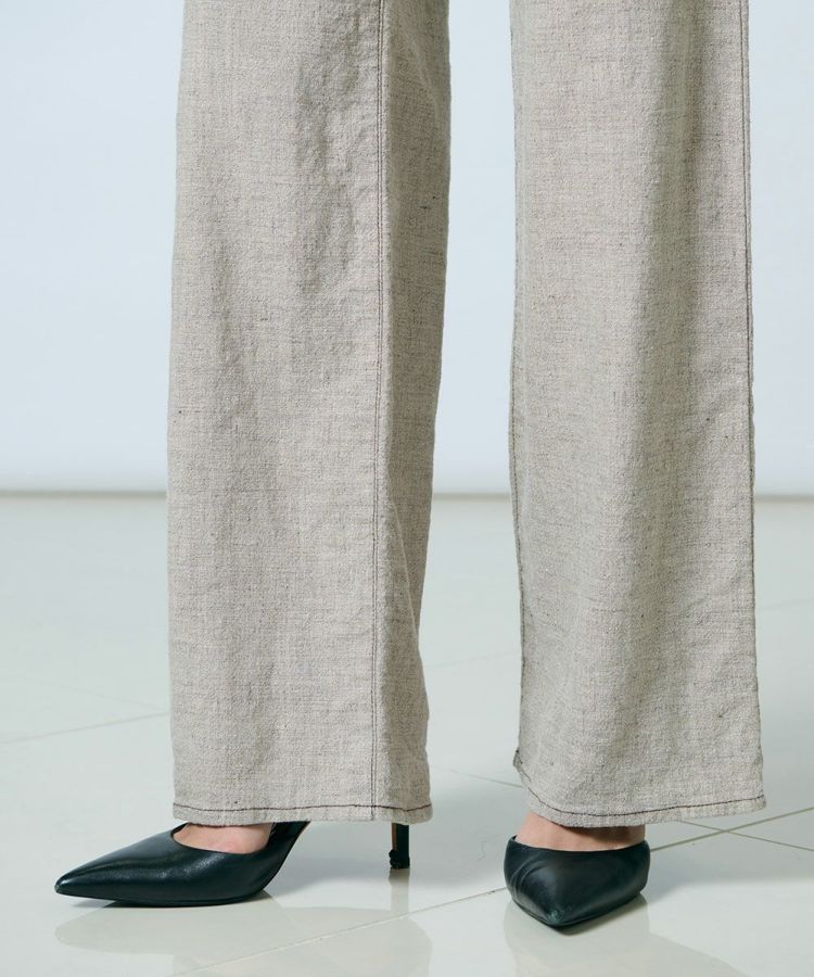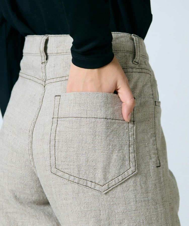 イタリア・ボノット社による、麻の太番手にウレタンのストレッチ性を掛け合わせた珍しい素材を使用したパンツ。ナチュラルな風合いが涼しげで、これ一本でコーディネートがぐんとリラクシンに仕上がります。ジーンズのようなデザインディテールもさりげないポイント。ワイドシルエットなので、穿き心地も楽チンです。