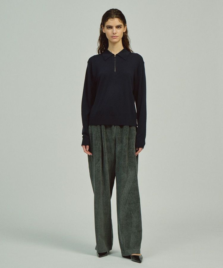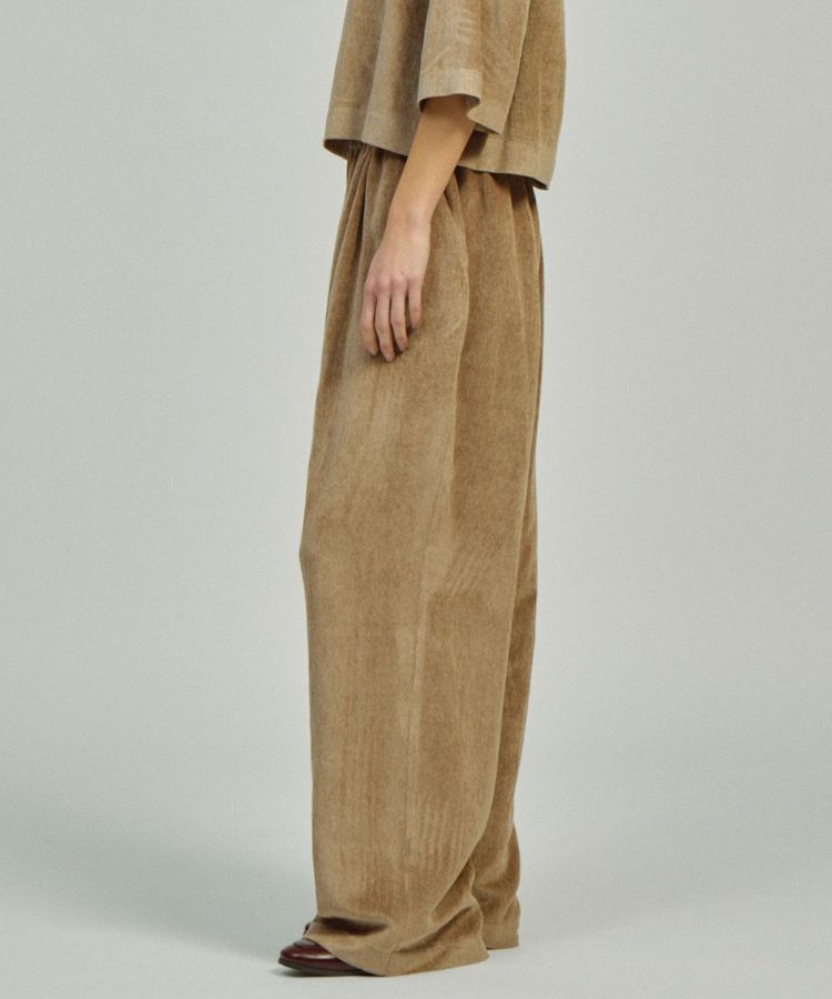 脚のラインを拾わず、ゆったりとしたシルエットで快適に穿けるパンツ。肌触りの良いヴィスコースコーデュロイ素材を使用し、柔らかくストレスフリーな着心地が魅力です。タック入りのデザインでゆとりのあるシルエットながらもスタイリッシュな印象に。デイリーからお出かけまで幅広く活躍する一着です。