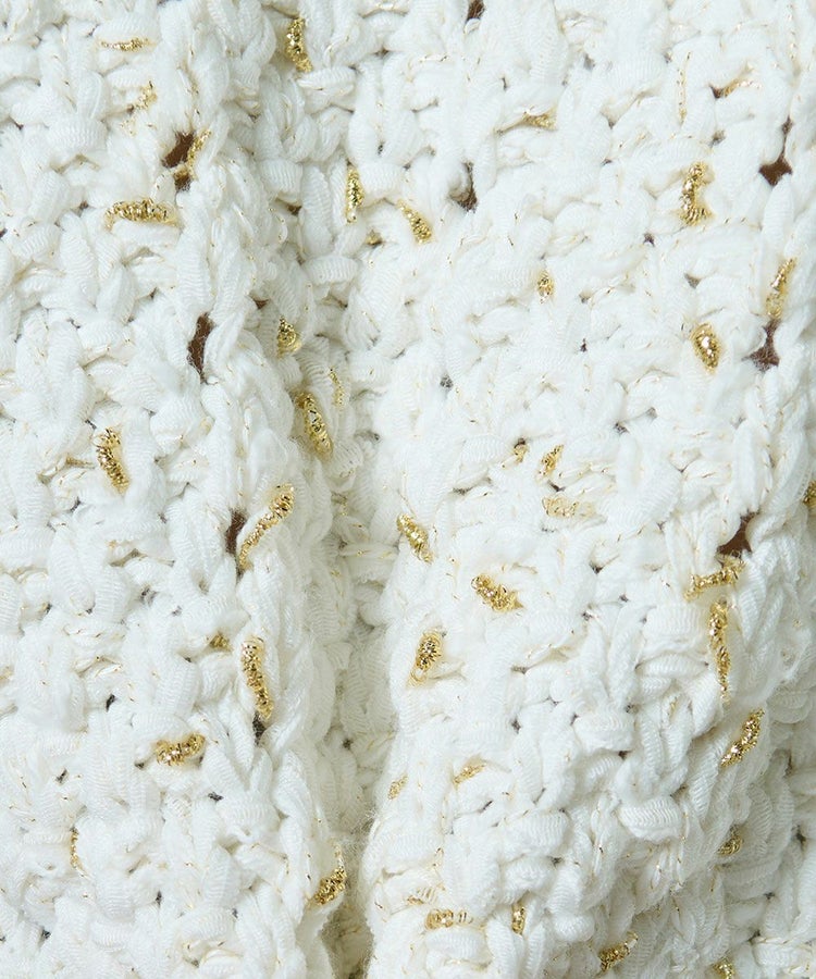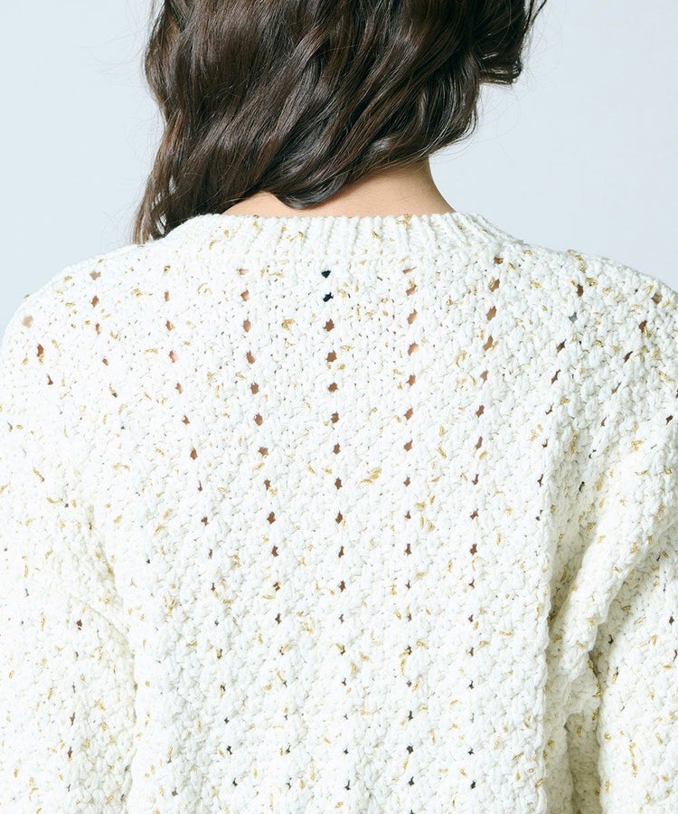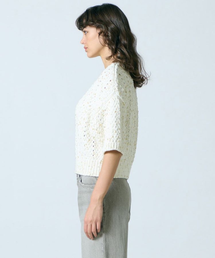 テープ糸とラメ糸など、4種類の異なる糸をMIXして編み込んだニットトップス。透け感のある編み地やゆったりとしたシルエットがリラクシンで、五分袖が二の腕をさりげなくカバーしながら、こなれた雰囲気を演出してくれます。ナチュラルながらも着映えするので、デニムに合わせるだけでもサマになるのが魅力的。スカートに合わせて柔らかな印象を楽しむのもおすすめです。