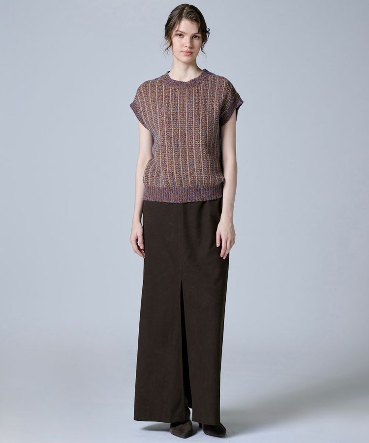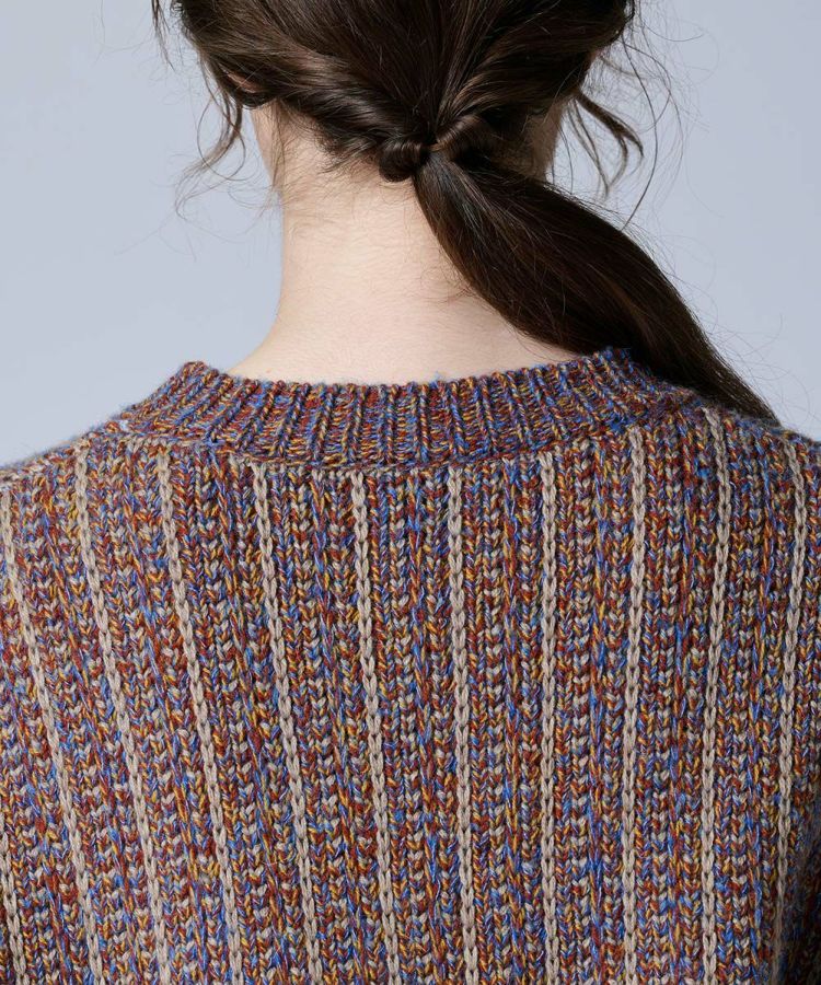落ち着いたカラーリングで大人っぽく着こなせるニットベスト。ストライプ柄が縦ラインを強調し、すっきりとした印象を与えてくれます。袖口や裾、首元には太めのリブをあしらい、シンプルながらもさりげないデザイン性をプラス。同トーンのシャツとレイヤードすれば、トレンド感のある大人のスクールライクなスタイルが完成します。