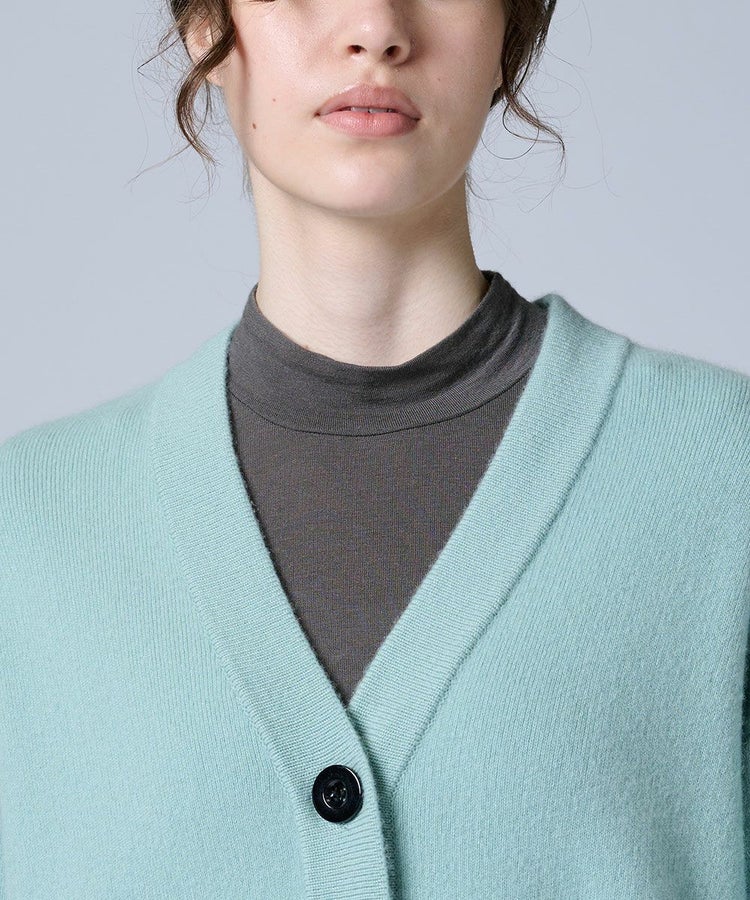 繊細でなめらかな質感が魅力の、カシミヤ100%カーディガン。ふんわりとしたミントカラーがスタイリングに爽やかな彩りを添え、羽織るだけで華やかな印象に仕上げてくれます。大きめのボタンが程よいアクセントになり、シンプルながらも上品な存在感を発揮。リブ仕様の袖口は伸縮性があり、冷気を防いで快適な着心地をキープします。