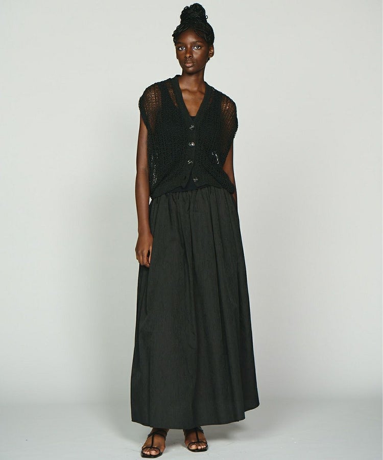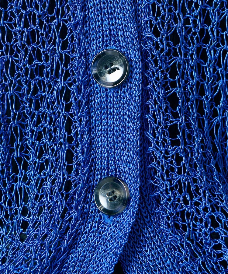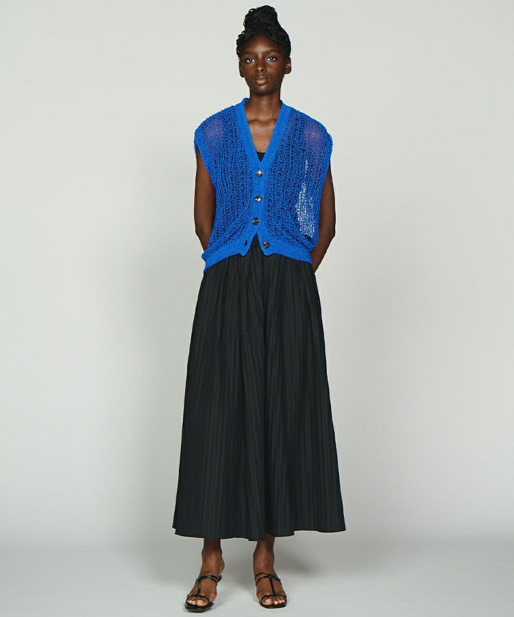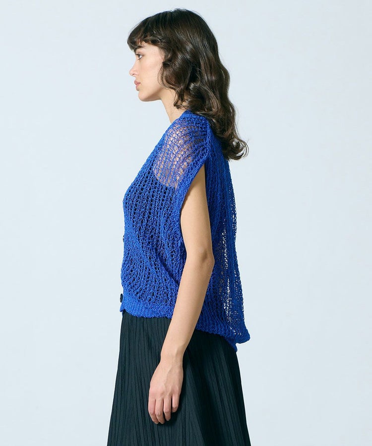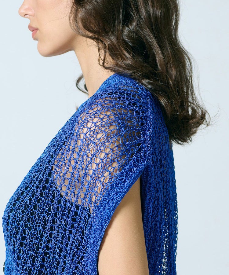 レース素材が涼しげなニットベスト。ブライトポリエステルと再生コットンをコイル状に仕上げた、贅沢な素材を使用しています。ゆったりとリラクシンなサイズ感もポイント。タンクトップなどとレイヤードするだけでサマになり、単調になりがちな夏のコーデに変化を与えてくれます。