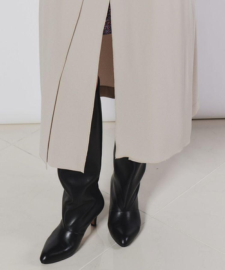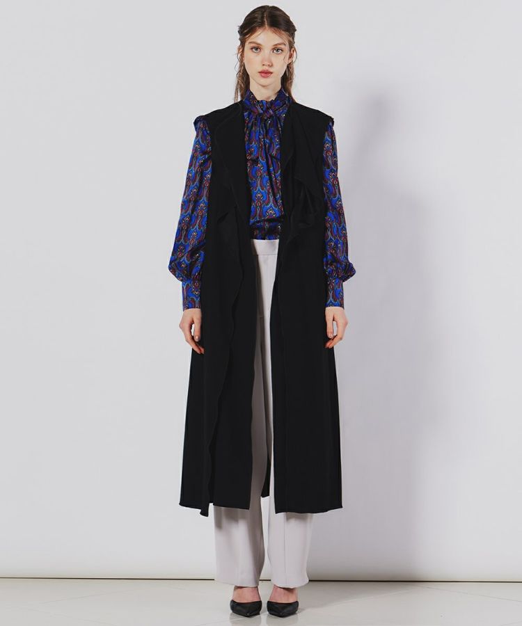 Sov.定番のバックサテン梨地を使用したロング丈のジレ。シャツやカットソー、タートルネックニットなどに羽織るだけでコーディネートを格上げできるレイヤードアイテムです。また、フリルのディテールが上品でフェミニンな印象をプラス。適度なストレッチ性と落ちすぎないドレープ感のある生地で、程良いふくらみがあり、しっかりと仕立て映えする一着です。