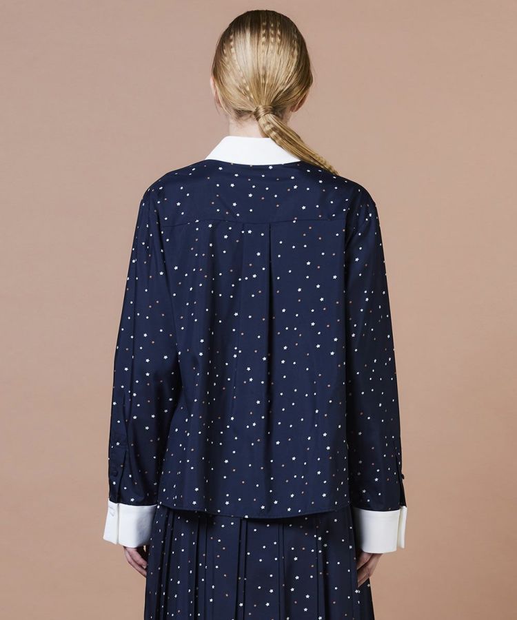 上品な光沢感となめらかな肌ざわりが魅力のポリエステルサテン生地を使用したシャツ。全面にあしらったポップな星柄が、大人の遊び心を感じさせるデザインです。大きめの白襟がコーディネートに程よくきちんと感をプラス。上品さとカジュアルさを兼ね備えたシャツは同素材のスカート(型番:0202531253)と合わせれば、周りと差がつくセットアップスタイルも楽しめます。