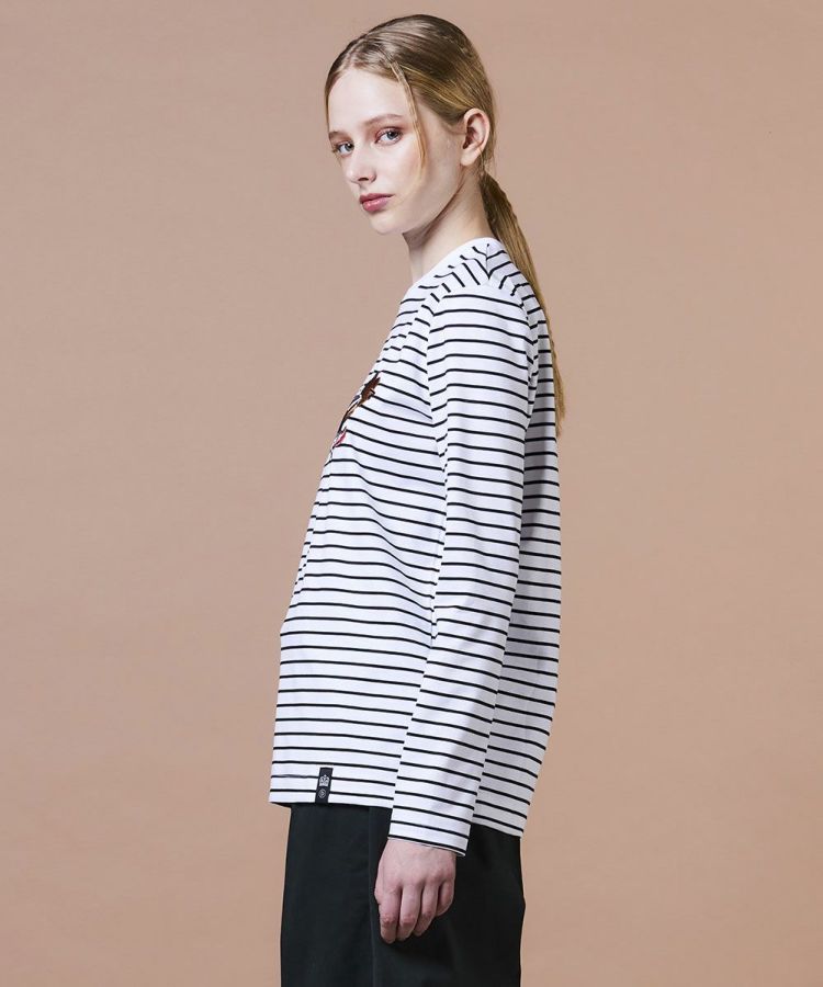 高級原綿スーピマコットンをハイゲージで編み上げ、柔らかな肌ざわりと上品な光沢感が魅力的な長袖Tシャツ。ボーダーは細めのピッチにしたことでカジュアルになりすぎず、きれいめな印象に仕上げました。胸元にはスキーをモチーフにしたBEARの刺繍をあしらい、さりげない遊び心をプラス。デニムやスラックスなどシンプルなボトムスとの相性が抜群です。