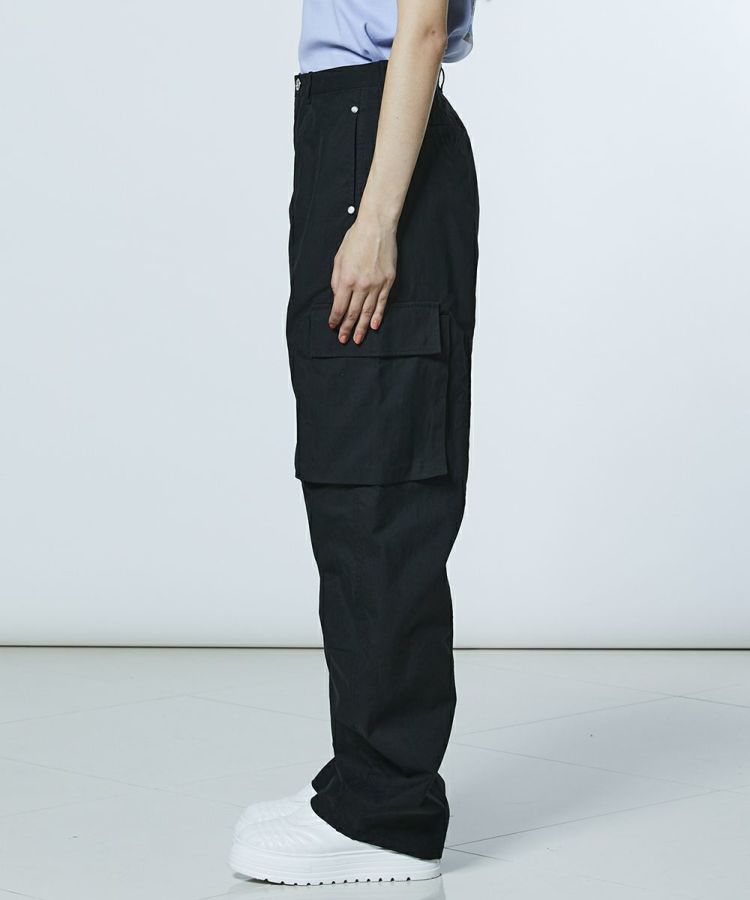 程よくゆとりを持たせたストレートシルエットで、きれいめにも穿きこなせるカーゴパンツ。ワッシャー加工を施すことで、ナチュラルでこなれた風合いに仕上げました。サイドのポケットがさりげないデザインアクセントに。定番のカーキと使い勝手の良いブラックの2色展開で、トップスを選ばず幅広いスタイリングに活躍する一本です。