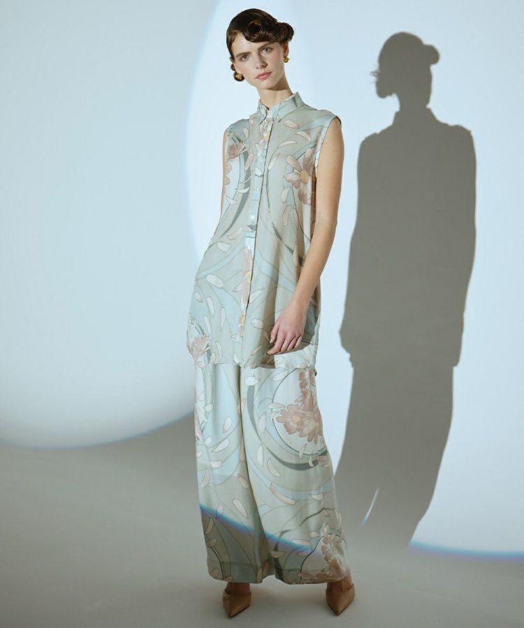 淡いトーンのノスタルジックなカラーリングが印象的な、柔らかな雰囲気を纏うパンツ。ゆったりとしたシルエットが体型を選ばずフィットしてくれるのがうれしいポイントです。程よい光沢感が上品な印象に。同素材のノースリーブシャツ(型番:0304141253)と合わせたセットアップスタイルもおすすめです。