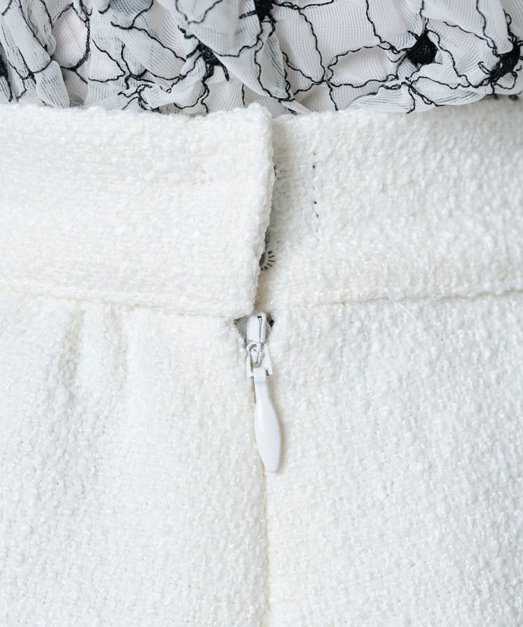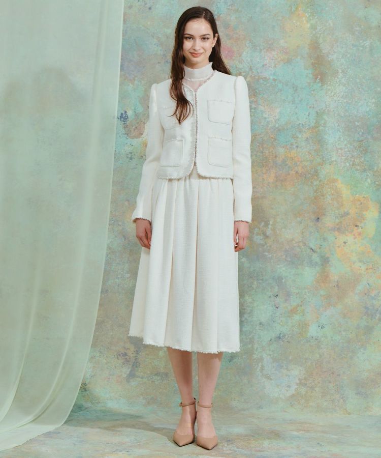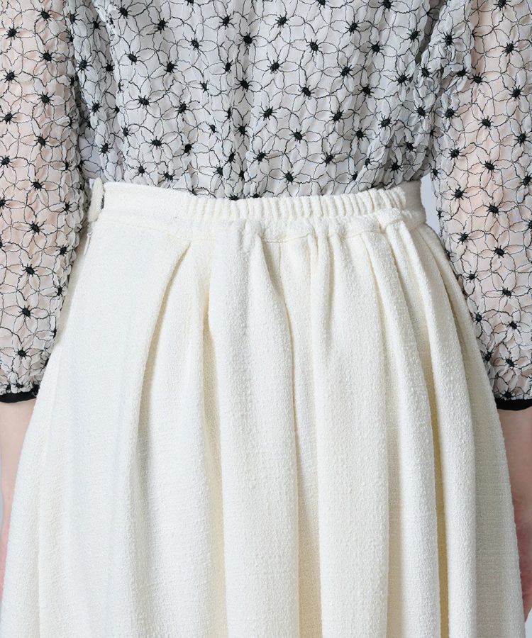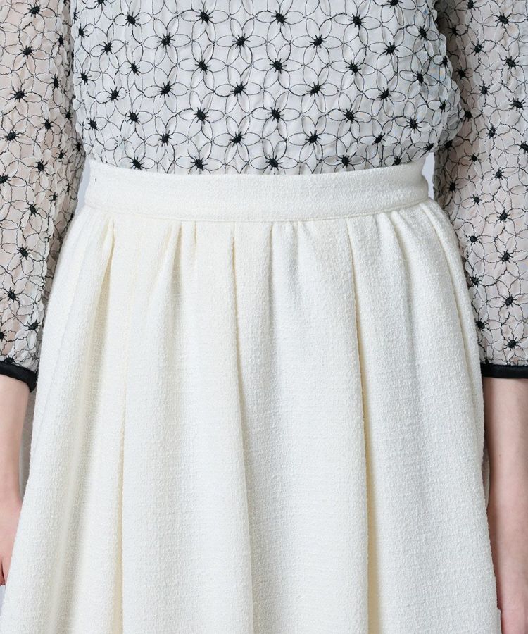 表情豊かなツイード素材を使用したスカート。程よいフレアシルエットが動くたびに美しく揺れ、エレガントな雰囲気を引き立てます。裾にはパールをあしらい、上品な華やかさをプラス。同素材のジャケット(型番:3805030261)と合わせれば、洗練されたセットアップスタイルが完成します。