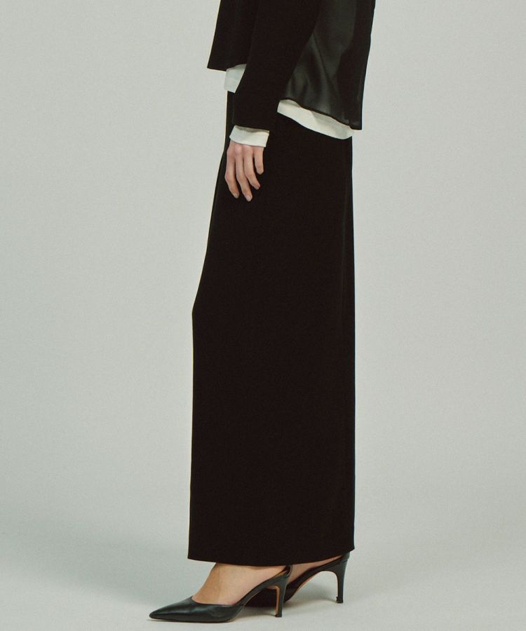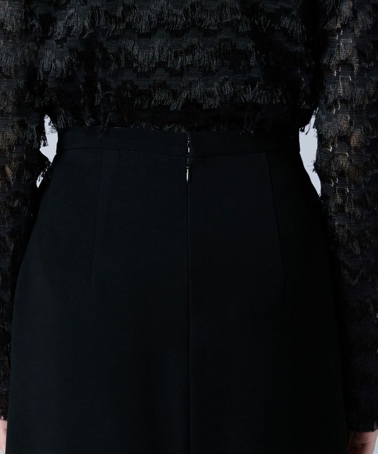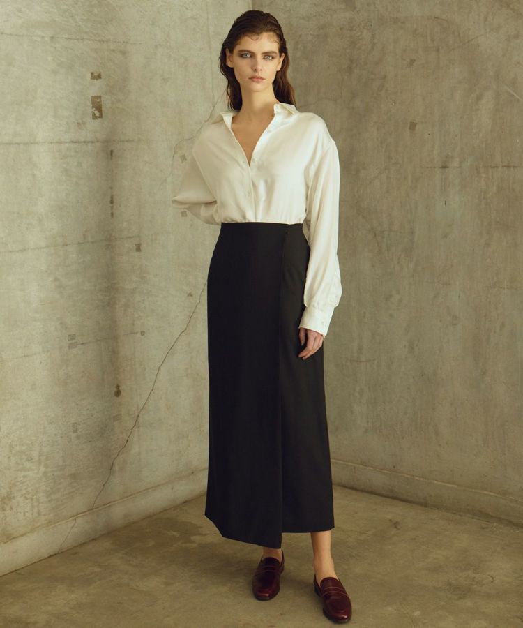 無駄のない美しいシルエットが際立つラップスカート。落ち感が美しく脚をすっきりと見せ、上品な印象を演出します。動くたびに揺れる生地が女性らしさを引き立てつつ、シンプルなデザインだからこそトップスを選ばず着回し力も抜群。オン・オフ問わず活躍する、ワードローブに1枚は欲しい万能スカートです。