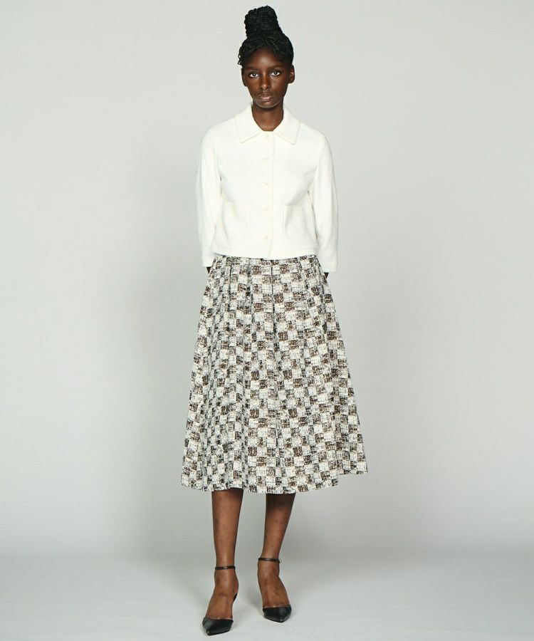 ブラウン×ホワイトのミックスツイードがエレガントで柔らかな印象を与えてくれるフレアスカート。表面の凹凸が風合いたっぷりで、イタリア・LINEAESSE社らしいジャガード素材となっています。ドレープがあるため、ウエストやヒップまわりを自然にカバーしてくれるのもうれしいポイント。フレアシルエットは、足元をすっきりと演出します。