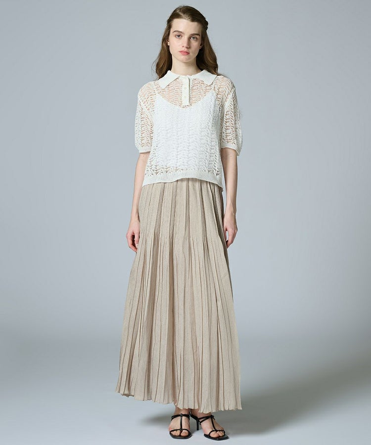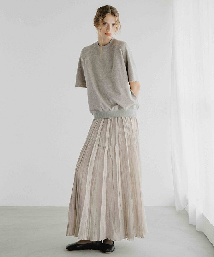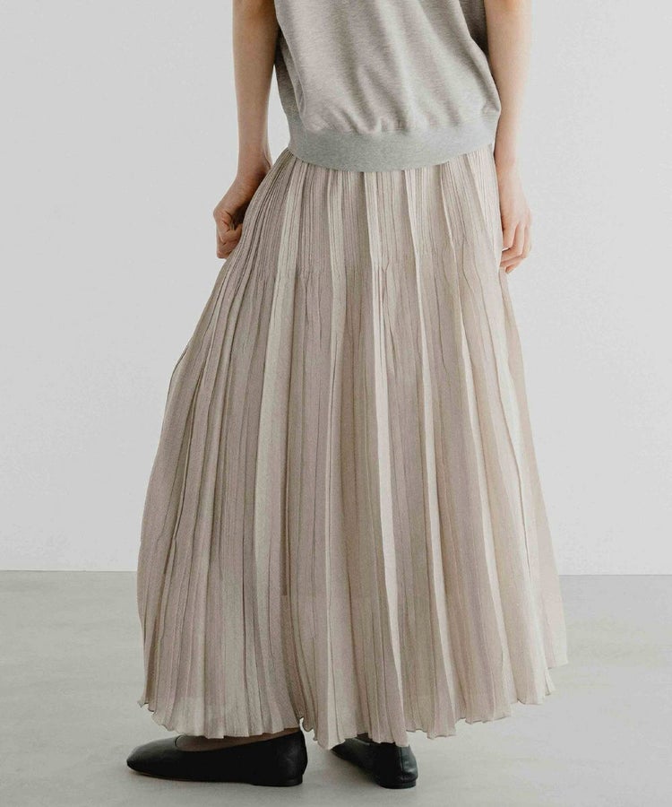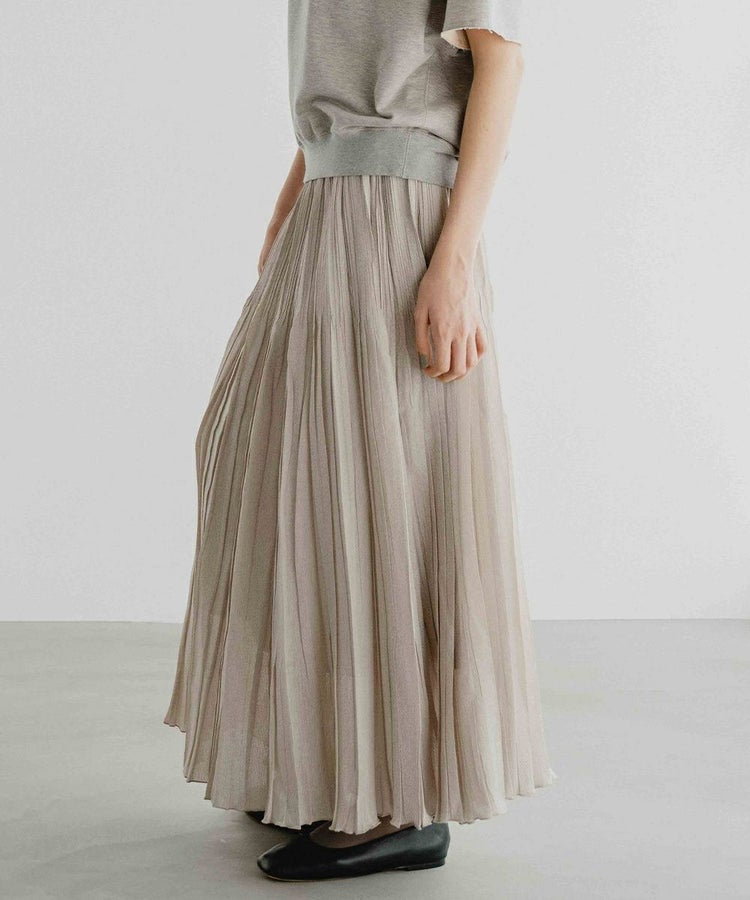 ほんのりとしたシアー感が上品な印象を与える、オーガンジー素材のスカート。プリーツが縦のラインを強調し、すっきりとしたシルエットを叶えてくれます。ウエストはゴム仕様でリラックス感のあるはき心地に仕上げ、ロング丈が脚のラインをさりげなくカバー。合わせるトップス次第で、カジュアルにもガーリーにも表情を変え、幅広いスタイリングに取り入れやすいアイテムです。