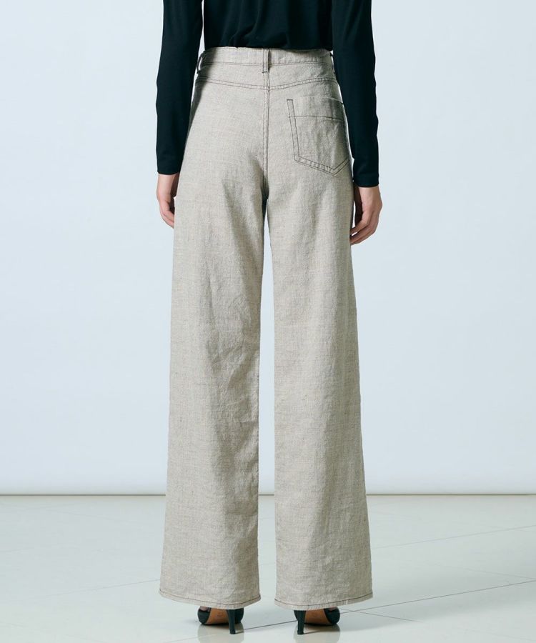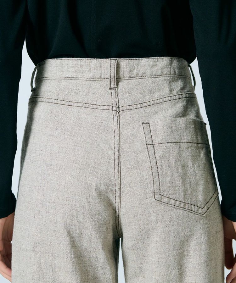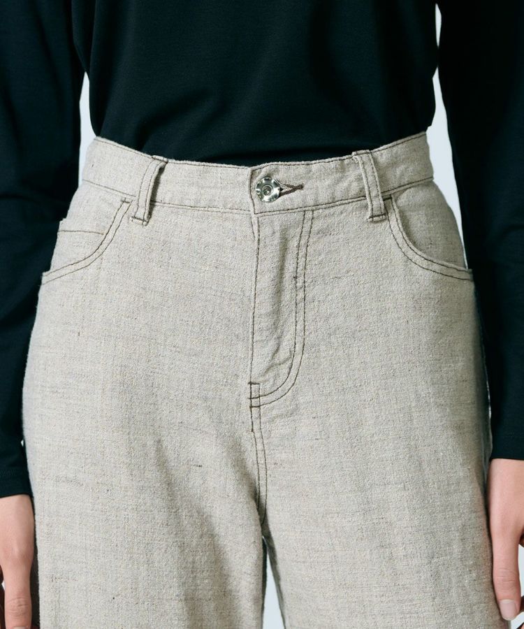 イタリア・ボノット社による、麻の太番手にウレタンのストレッチ性を掛け合わせた珍しい素材を使用したパンツ。ナチュラルな風合いが涼しげで、これ一本でコーディネートがぐんとリラクシンに仕上がります。ジーンズのようなデザインディテールもさりげないポイント。ワイドシルエットなので、穿き心地も楽チンです。
