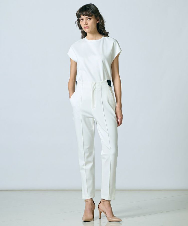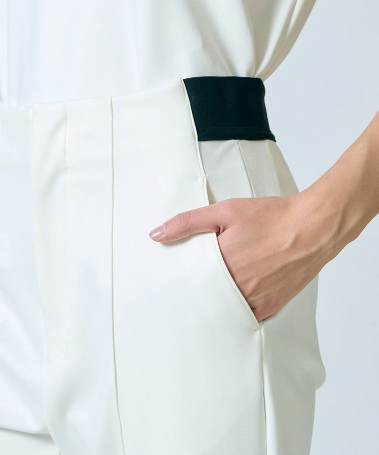 ナイロンハイマルチの糸を使用し、段ボール組織で仕上げたパンツ。ストレッチ性があるため、動きやすくストレスフルな着心地が魅力です。また、肌あたりは柔らかでありながらハリ、コシがあるため、きちんと感のある佇まいが叶うのもポイント。細身のストレートシルエットがスタイリッシュな印象で、アンクル丈はすっきりとした足元を演出してくれます。