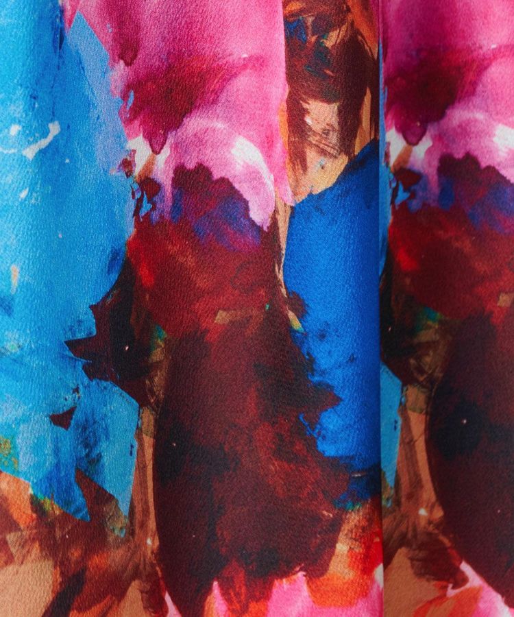 絵画のような印象的なタッチで描いたプリント柄が目を惹くワンピース。ビビッドなカラーリングも華やかです。レトロなシャツデザインもポイントで、どこかノスタルジックな雰囲気。ややボリュームのある袖は、腕のラインをきれいに演出してくれます。また、スカート部分は切り替えをつけ、さらにドレープを効かせることで、横や前から見た時のシルエットがとてもきれいです。