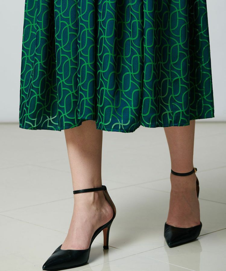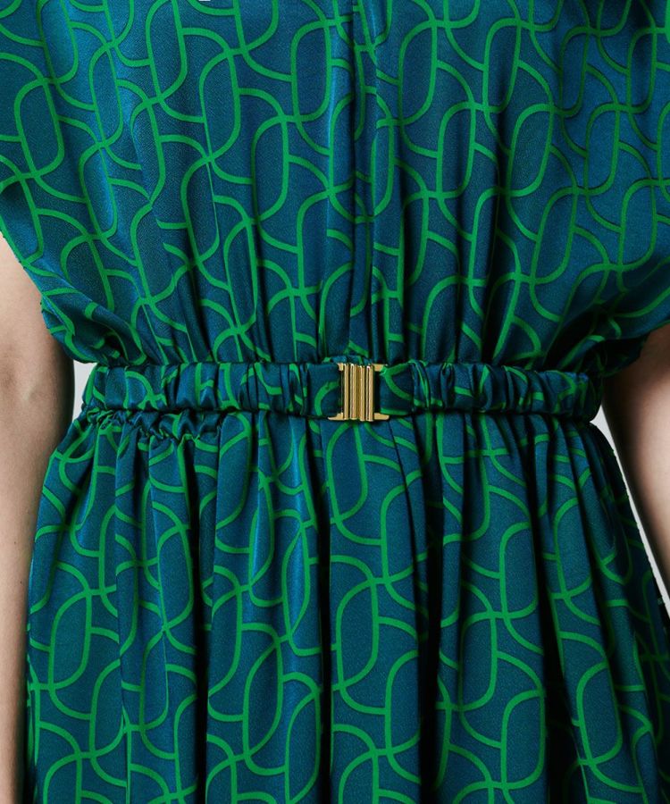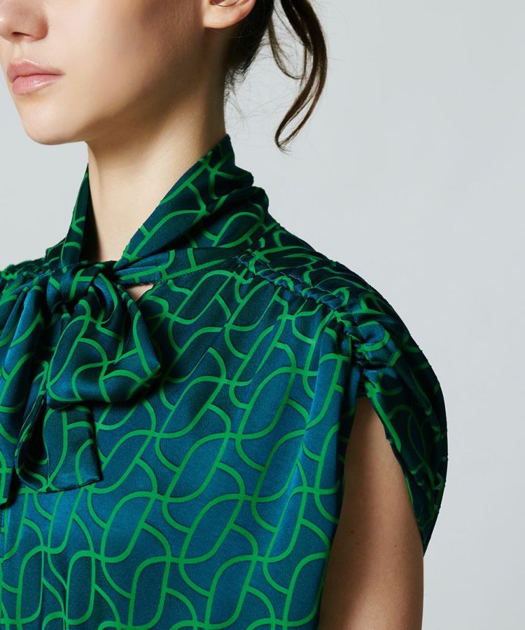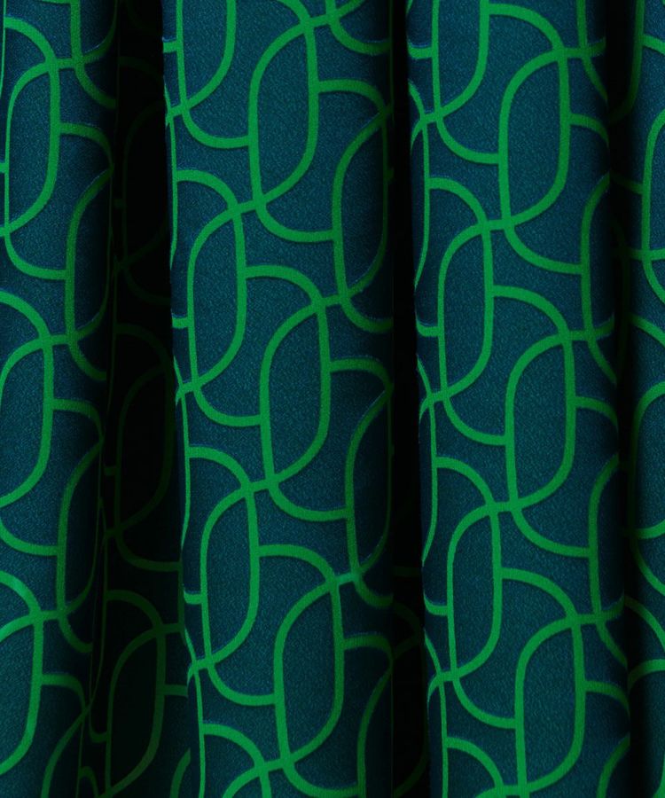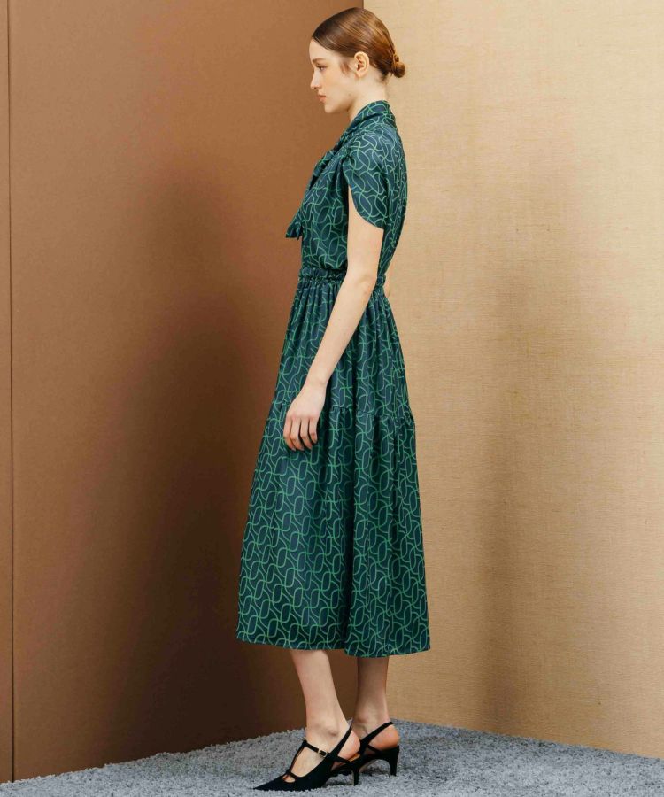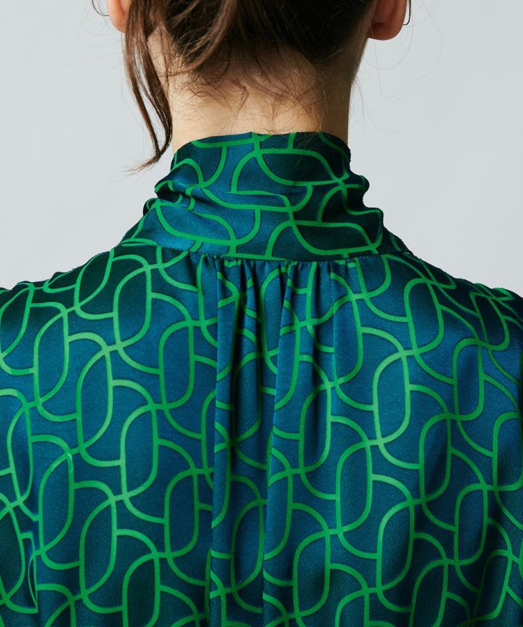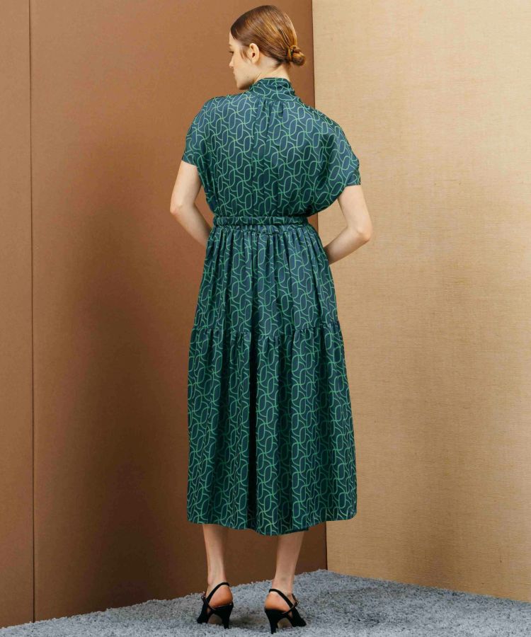 鮮やかでエレガントなカラーリングと幾何学模様がクラシカルな印象を与えるワンピース。光沢感のある素材や切り替えになったAラインシルエットのスカートは、エレガントなムードをプラスします。クシュっと絞りになったショルダーの切り替えは、肩のラインを柔らかに演出。腕のラインを女性らしく、きれいに見せてくれるのもうれしいポイントです。これ一枚で着映えするワンピースに仕上がっています。